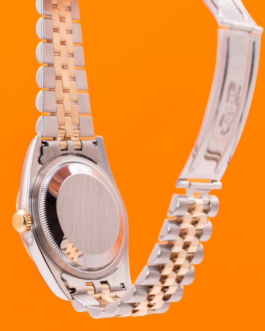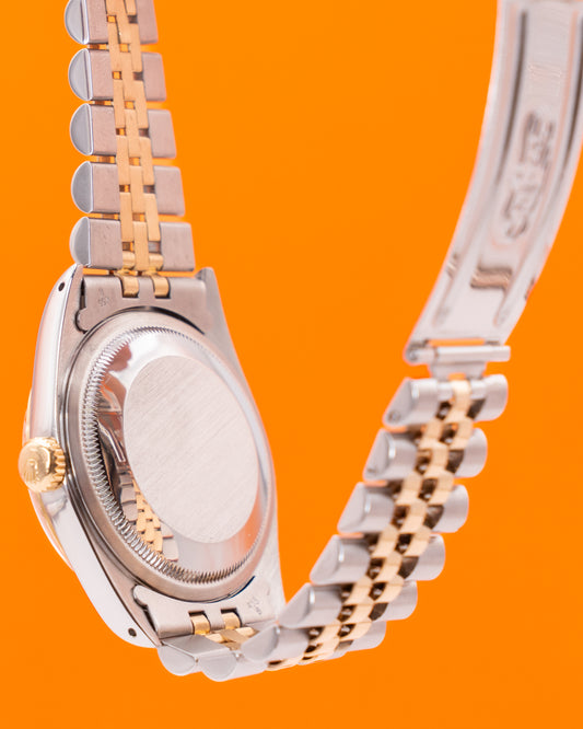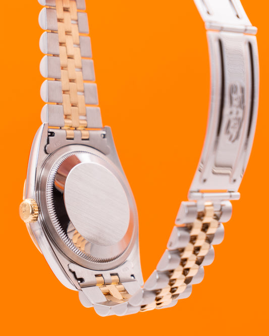 Rolex Datejust 36mm 16233 White Arabic Motif Dial Two Tone Yellow Gold Fluted Jubilee