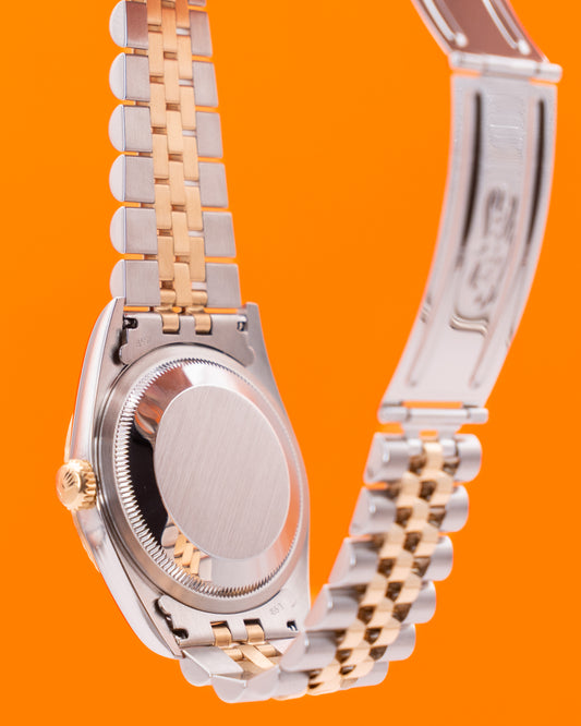 Rolex Datejust 36mm 16233 White Arabic Motif Dial Two Tone Yellow Gold Fluted Jubilee