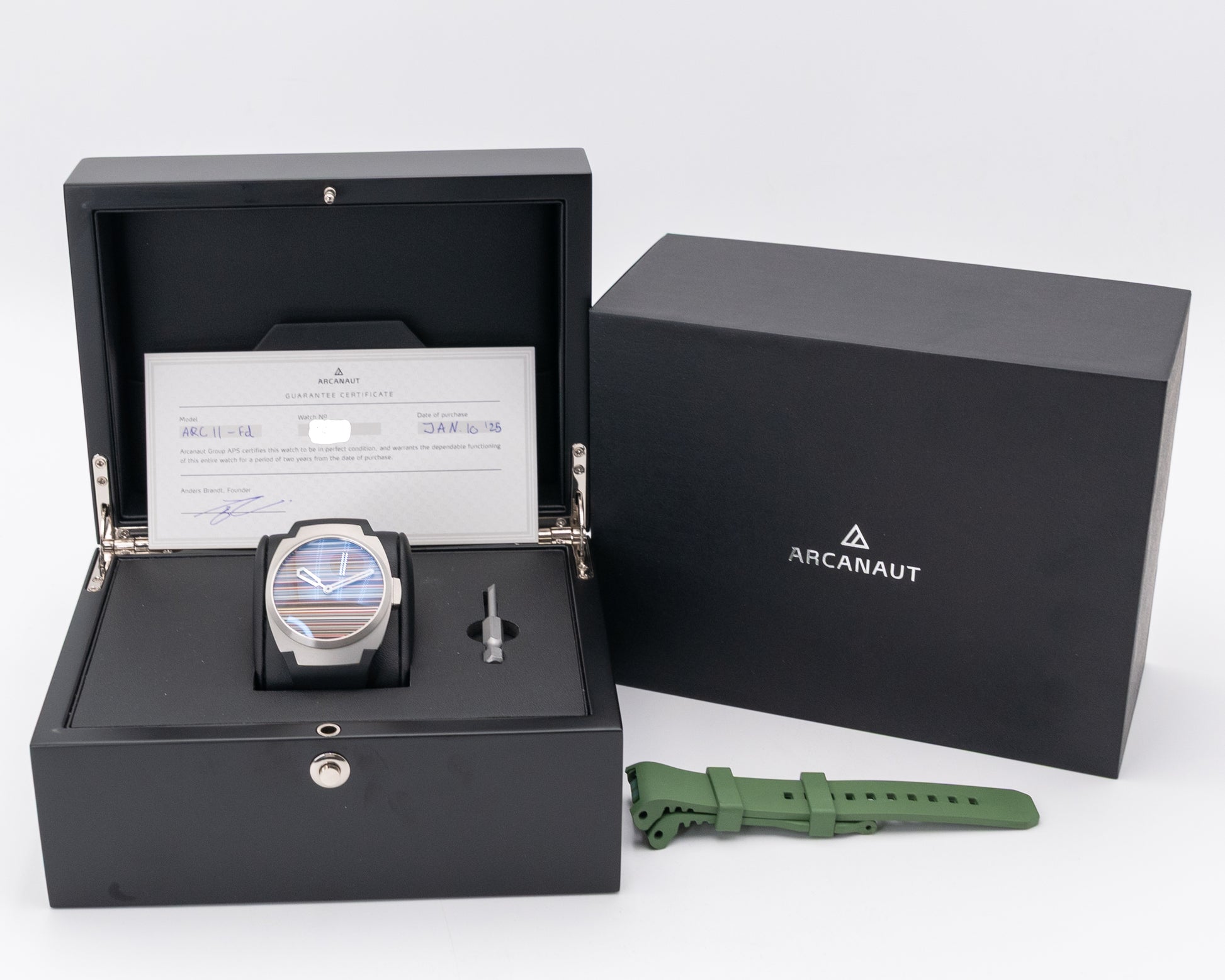 Inside, the Arc II Fordite Linear Dial is powered by a Swiss automatic movement, offering precision and reliability to match its avant-garde design. Every detail—from the fine case finishing to the seamless integration of the strap—reflects Arcanaut’s meticulous craftsmanship and dedication to originality. Designed and assembled in Copenhagen, this edition celebrates the brand’s spirit of innovation and sustainability, transforming industrial heritage into wearable art. The result is a bold, one-of-a-kind timepiece that merges history, creativity, and cutting-edge horology in perfect harmony.
