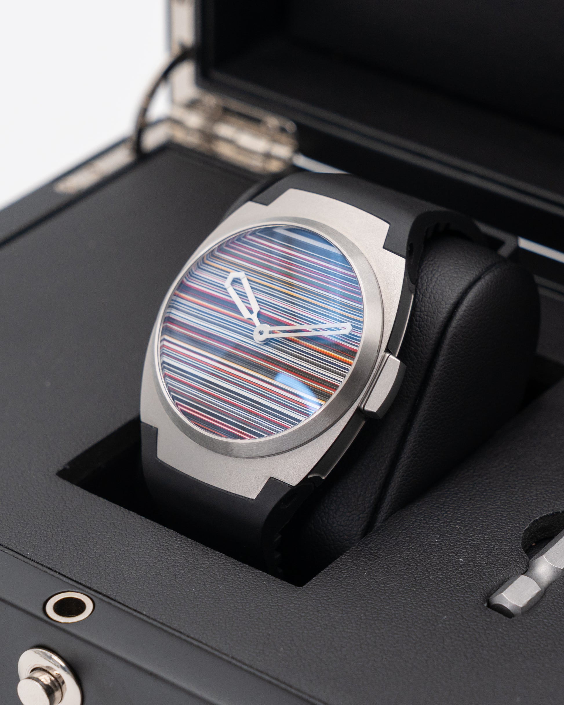 The Arcanaut Arc II Fordite Linear Dial 41mm (2025) is a striking embodiment of contemporary Scandinavian design and artistic experimentation. Its 41 mm stainless steel case showcases Arcanaut’s distinct architectural form, defined by crisp angles and smooth transitions that give it a modern, sculptural presence. The Fordite dial—crafted from layers of cured automotive paint once used in classic car manufacturing—is the centerpiece of this creation. Each dial displays a unique pattern of vivid striations, ensuring no two watches are ever alike. Paired with a minimalist rubber strap, this timepiece exudes both individuality and understated elegance.