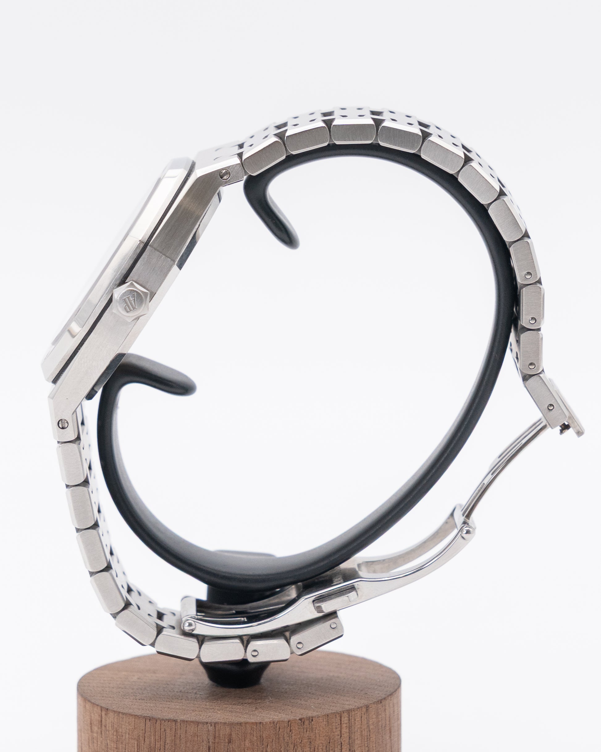 The Audemars Piguet Royal Oak 15300ST.OO.1220ST.03 is a timeless expression of sport-luxury design, crafted entirely from stainless steel and finished to the brand’s legendary standards. Its 39 mm case showcases the iconic octagonal bezel with exposed screws, a defining element of the Royal Oak lineage. The black “Grande Tapisserie” dial offers an exquisite texture, accented by white gold hour markers and hands, delivering a clean yet powerful aesthetic. Completing the design is the integrated stainless steel bracelet, renowned for its comfort, balance, and seamless flow from case to clasp.