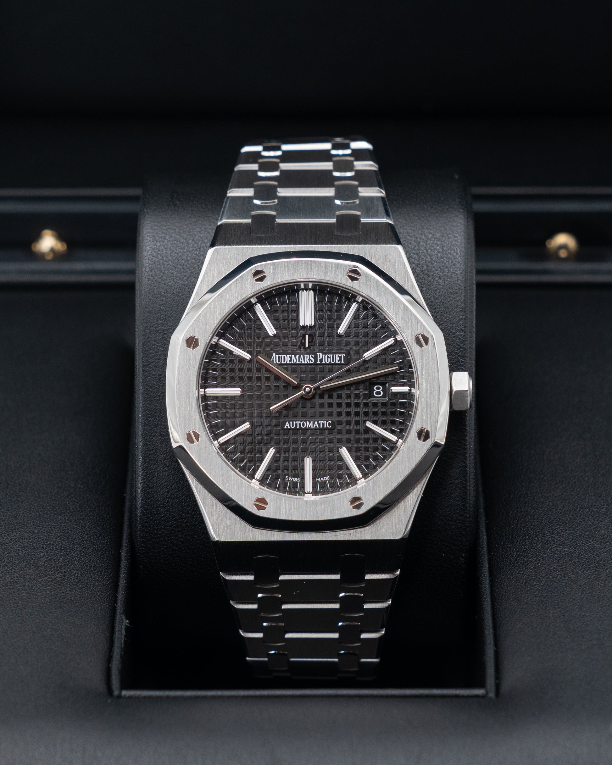 The Audemars Piguet Royal Oak reference 15400ST.OO.1220ST.01 is a modern evolution of the legendary Royal Oak, offering a bold yet refined interpretation of Gérald Genta’s timeless design. Its 41 mm stainless steel case retains the iconic octagonal bezel with exposed hexagonal screws, a hallmark of the Royal Oak’s identity. The black “Grande Tapisserie” dial adds depth and texture, contrasted by applied white gold hour markers and luminescent hands for excellent readability. The seamless integration of the case and bracelet creates a sleek, architectural aesthetic that is both sporty and sophisticated.