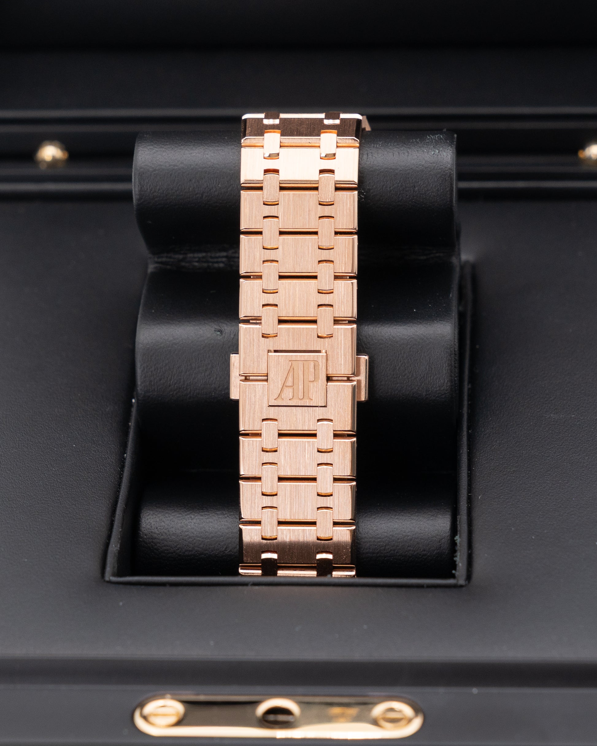 Powered by the in-house Caliber AP 4302, this automatic movement delivers precision and reliability with a 70-hour power reserve. The integrated pink gold bracelet with brushed and polished finishing flows seamlessly into the case, providing both comfort and prestige. Elegant, modern, and instantly recognizable, this Royal Oak represents the perfect harmony of technical innovation and timeless design—an enduring statement of Audemars Piguet’s horological excellence.