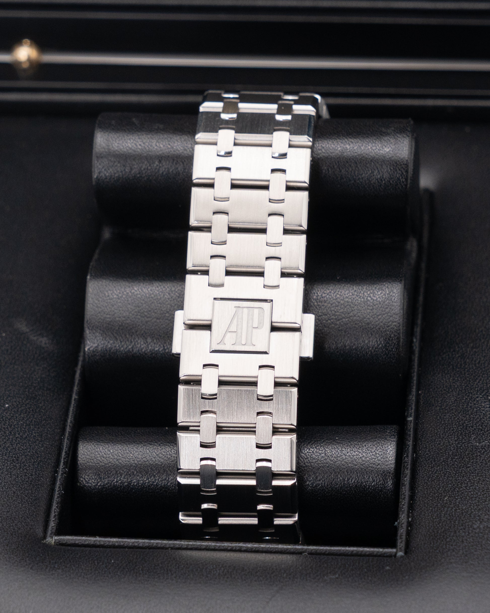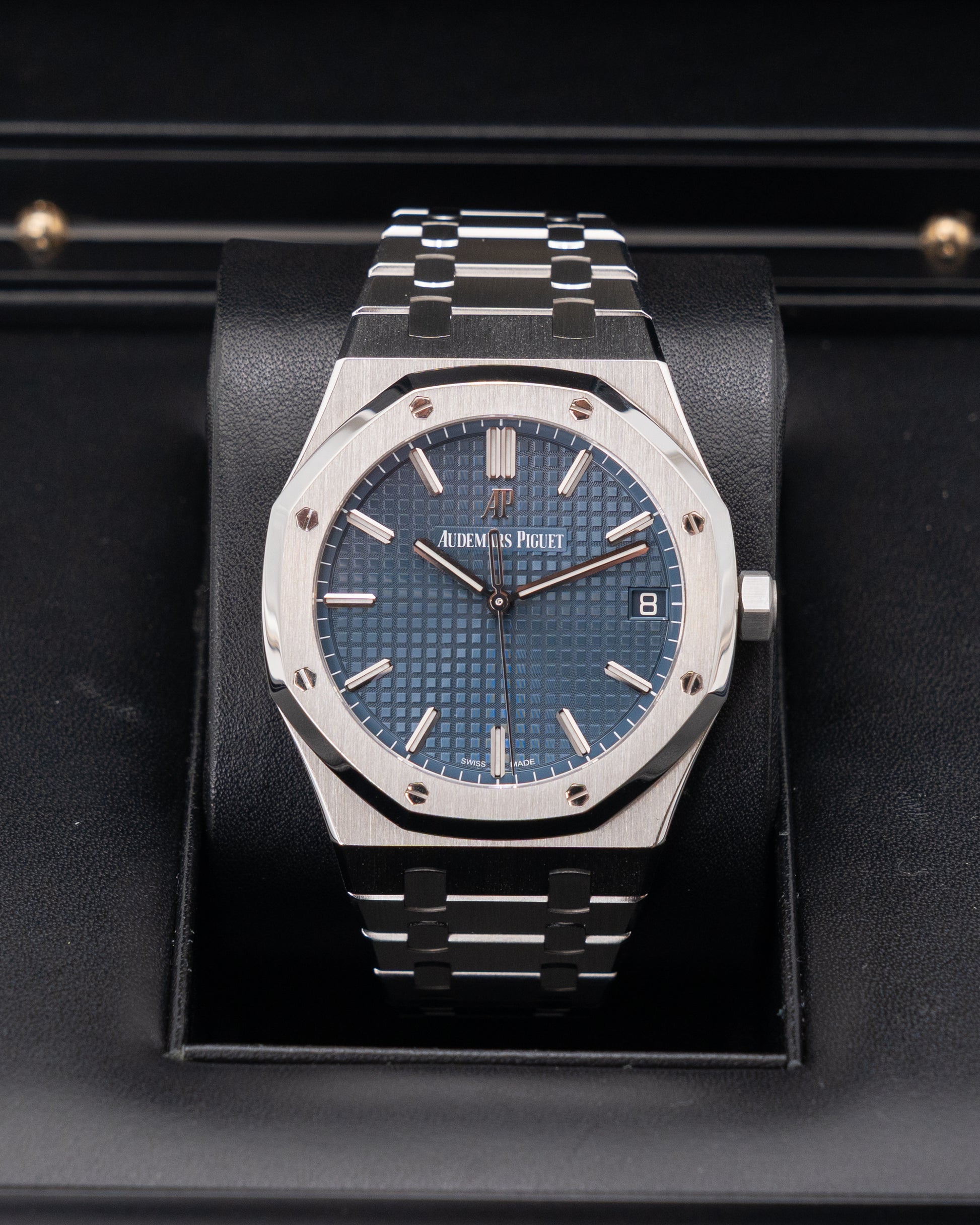 The Audemars Piguet Royal Oak reference 15500ST.OO.1220ST.01 represents the perfect harmony of sportiness, luxury, and technical mastery. Crafted entirely from stainless steel, its 41 mm case features the signature octagonal bezel with exposed white gold screws, an instantly recognizable hallmark of the Royal Oak lineage. The deep blue “Grande Tapisserie” dial offers a stunning play of light and texture, enhanced by luminous white gold hour markers and hands for optimal legibility. Every detail—from the perfectly brushed surfaces to the polished edges—demonstrates Audemars Piguet’s unparalleled craftsmanship.