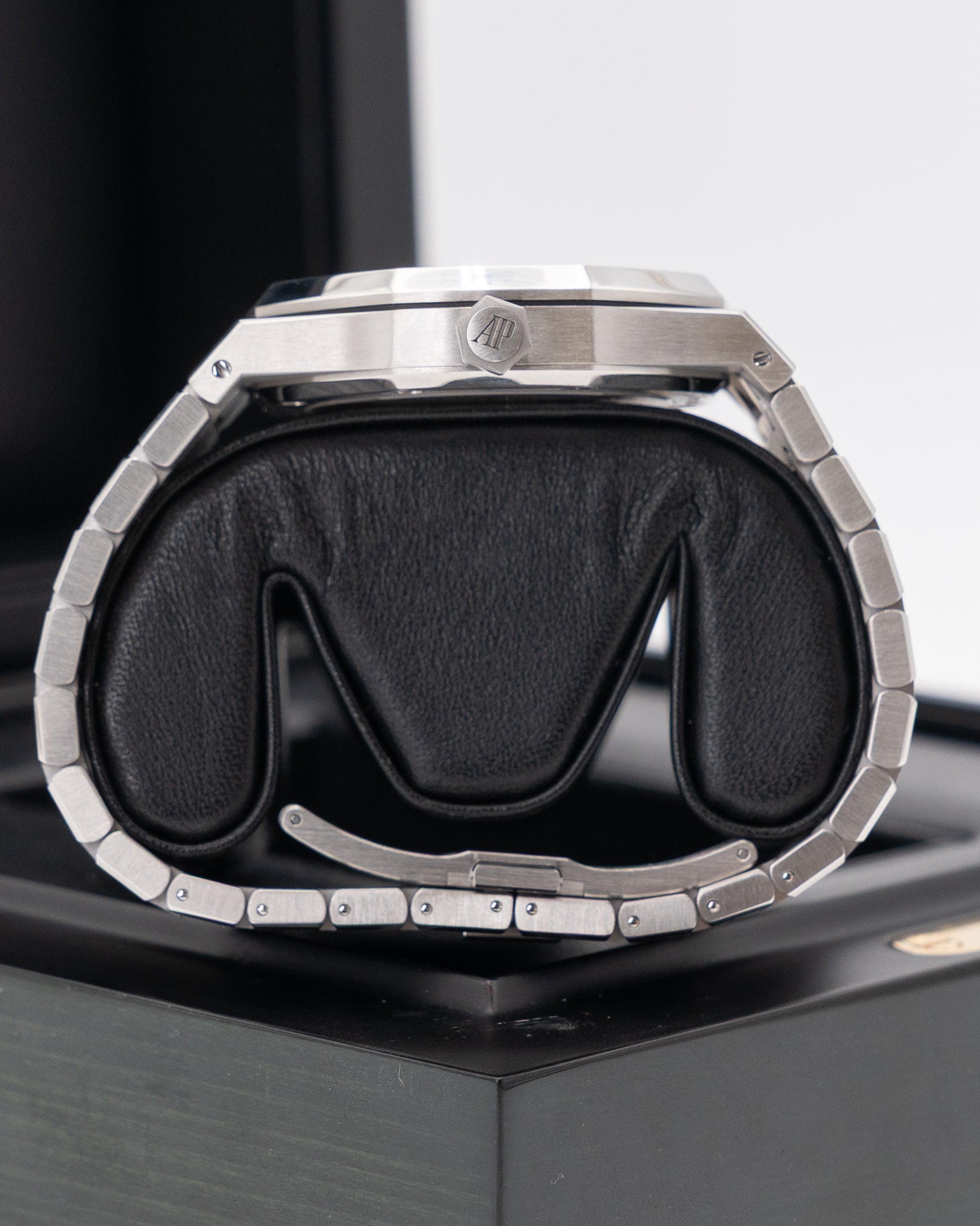 At its core beats the in-house Caliber 4302, a self-winding movement that delivers exceptional accuracy, durability, and a 70-hour power reserve. The exhibition caseback reveals the beautifully decorated rotor and bridges, underscoring the brand’s dedication to haute horlogerie. Completed with the integrated stainless steel bracelet that defines the Royal Oak’s bold yet elegant character, the 15500ST.OO.1220ST.01 stands as a contemporary icon—combining precision, presence, and timeless design in one extraordinary timepiece.