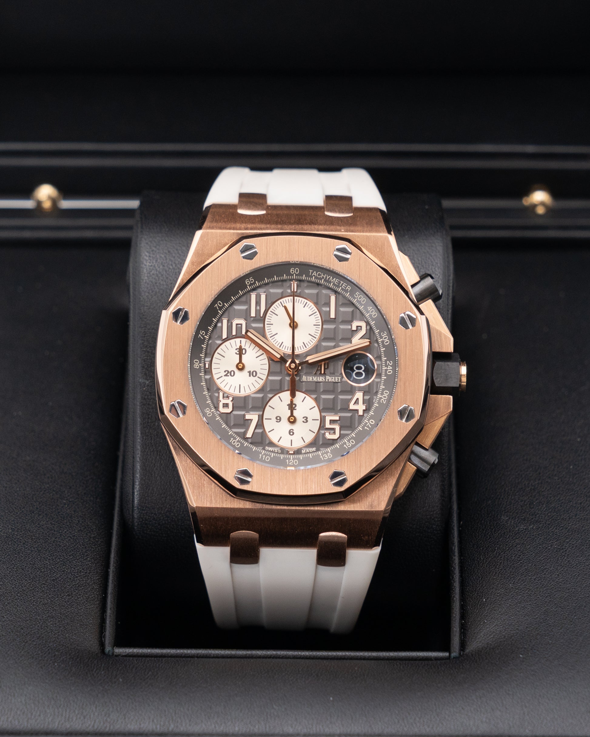 The Audemars Piguet Royal Oak Offshore Selfwinding Chronograph ref. 26470OR.OO.A125CR.01.A is a commanding expression of sport-luxury craftsmanship in 18-carat pink gold. Measuring 42 mm, the case features AP’s signature octagonal bezel with visible screws and a striking grey Méga Tapisserie dial, accented by bold rose gold hour markers and hands. The black sub-dials and tachymeter scale provide sharp contrast, enhancing legibility while preserving the watch’s distinctive visual depth. The pink gold case is complemented by black ceramic pushers and crown, merging elegance with resilience.