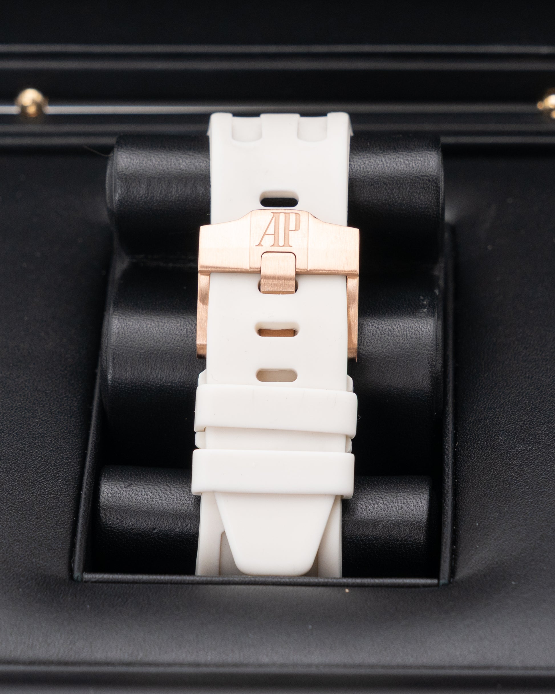 Inside, the watch is powered by the Caliber 3126/3840, a self-winding chronograph movement known for its precision and 50-hour power reserve. It comes fitted on a hand-stitched black alligator leather strap that perfectly balances the warm tone of the case. Water-resistant to 100 meters, this Royal Oak Offshore captures both strength and refinement — a bold statement piece that reflects Audemars Piguet’s dedication to modern horological artistry.