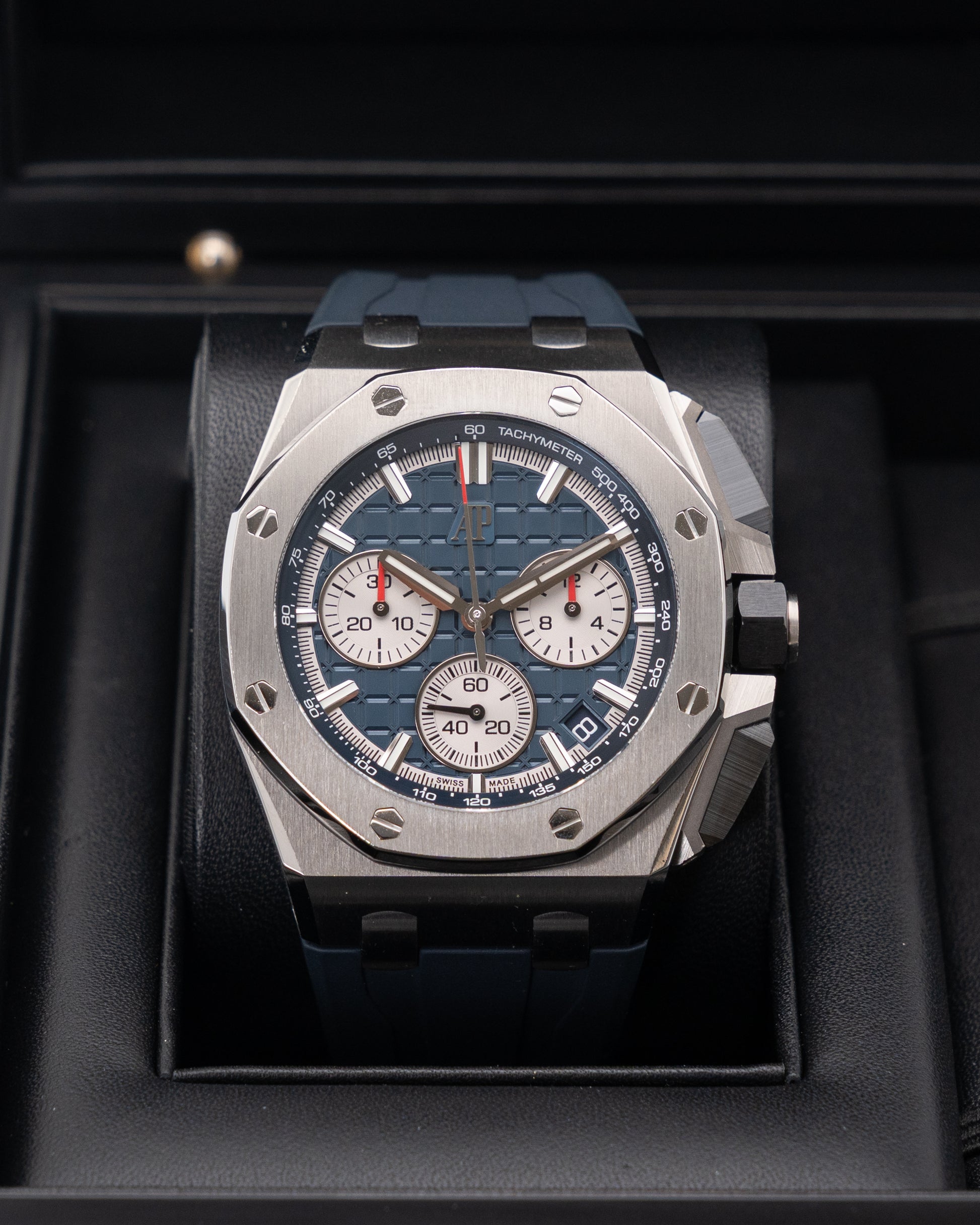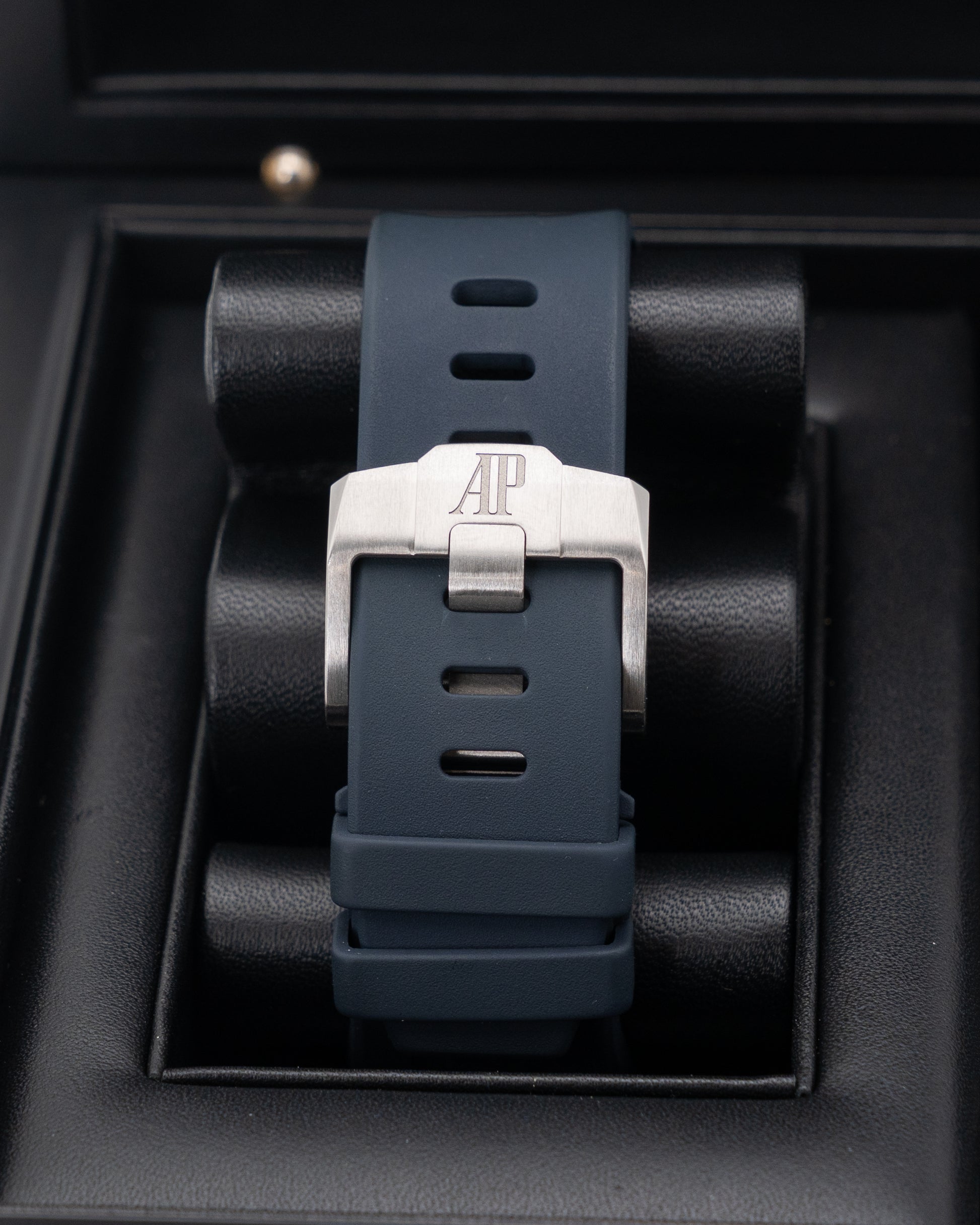 The Audemars Piguet Royal Oak Offshore Selfwinding Chronograph ref. 26420TI.OO.A027CA.01 combines technical innovation with a bold, contemporary aesthetic. Crafted from lightweight titanium, its 43mm case delivers both strength and comfort, making it ideal for everyday wear despite its commanding presence. The blue “Méga Tapisserie” dial enhances the watch’s visual depth, complemented by contrasting silver subdials, luminescent markers, and the iconic Royal Oak hands for optimal legibility. The design is completed with a robust blue rubber strap, ensuring both sportiness and sophistication.