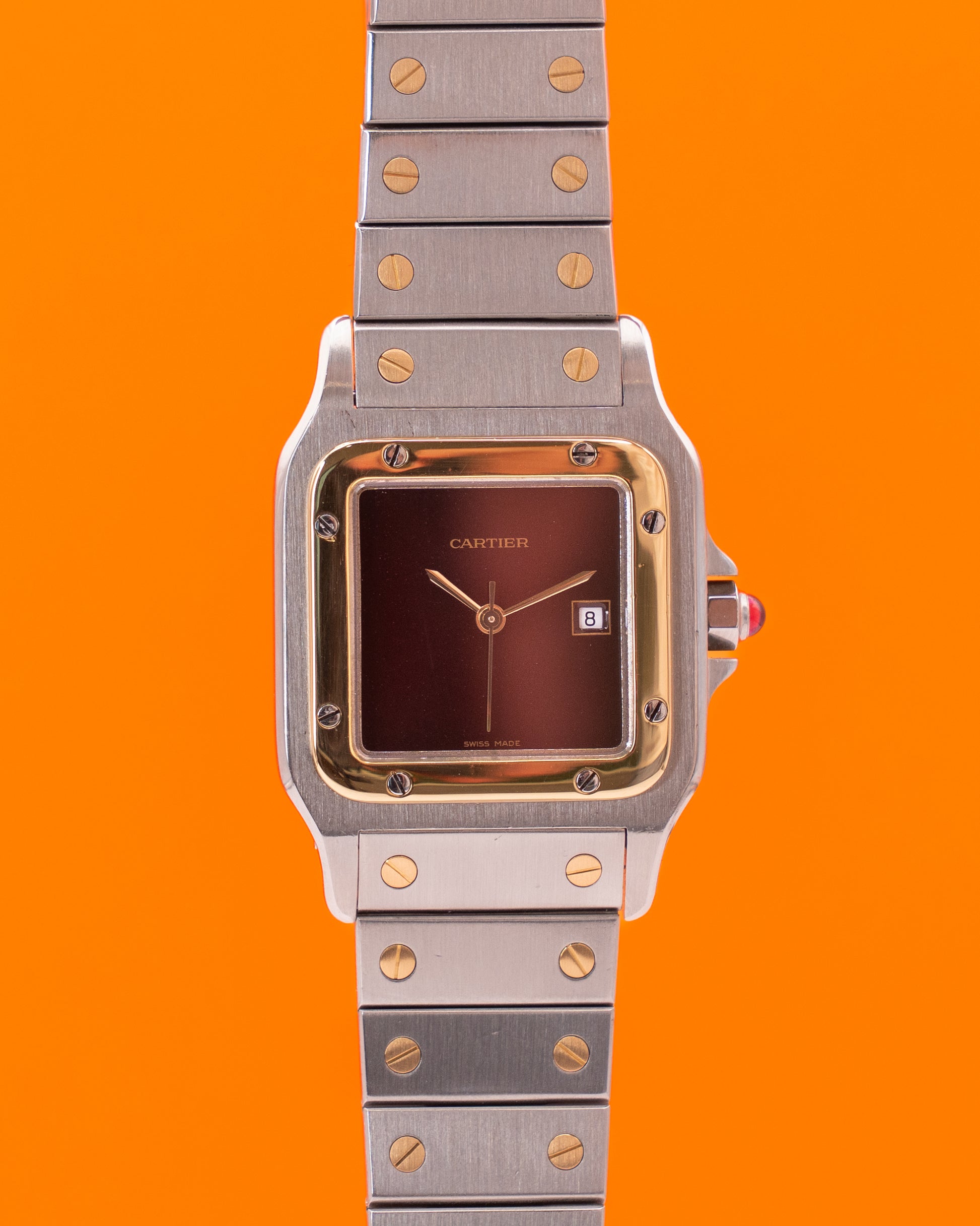 The standout feature of this model is its rich burgundy dial, which adds a vibrant and sophisticated touch to the design. The deep red hue enhances the watch’s visual appeal, making it a unique statement piece. Paired with the sleek stainless steel bracelet, the Santos Carrée 2961 is a perfect fusion of classic Cartier style and modern flair, appealing to those who appreciate refined craftsmanship with a touch of personality.