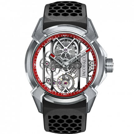 Jacob & Co. Epic X Titanium Red Neoralithe Inner Ring 44 mm watch. Model reference: EX110.20.AA.AG.ABRUA. Titanium case. Skeleton dial. Manual-winding movement. Black rubber strap with titanium pin buckle. Swiss made. The watch comes in the original packaging, with a set of documents and 2 years warranty. At Modern Wrist we offer new authentic watches at the best prices.