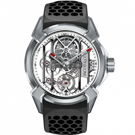 Jacob & Co. Epic X Titanium White Neoralithe Inner Ring 44 mm watch. Model reference: EX100.20.NS.WB.A. Titanium case. Skeleton dial. Manual-winding movement. This watch is coming with 2 straps: a black rubber strap and an additional black alligator leather strap. Swiss made. The watch comes in the original packaging, with a set of documents and 2 years warranty. At Modern Wrist we offer new authentic watches at the best prices.