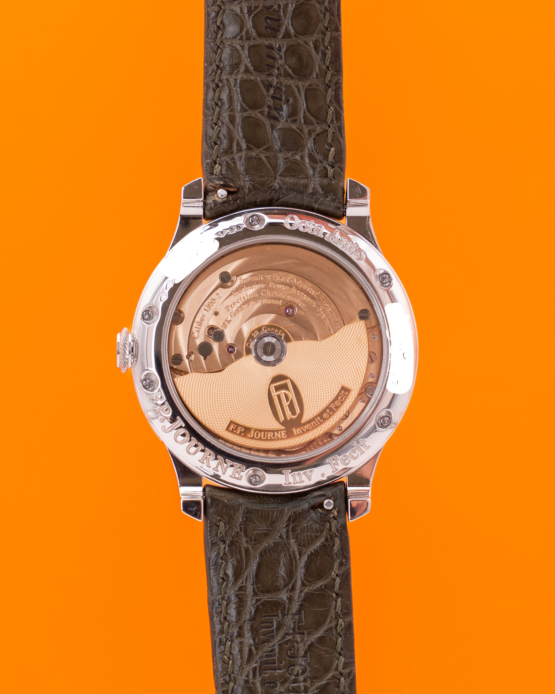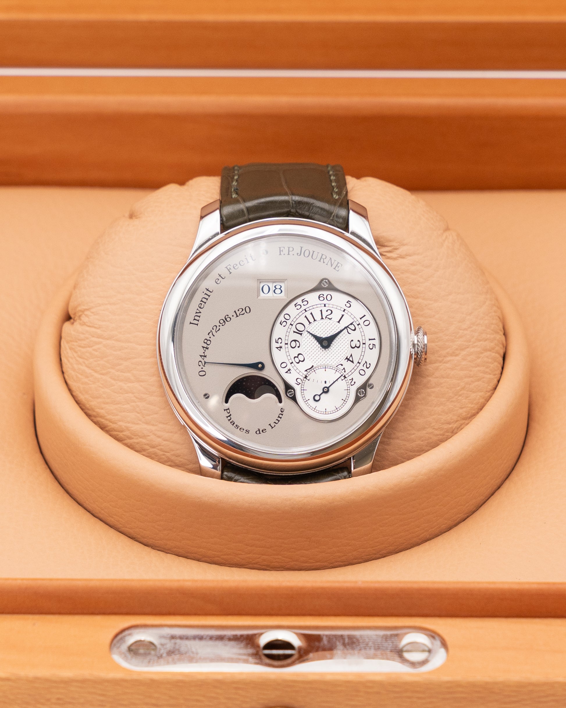 Inside, the Octa Lune is powered by the in-house automatic Caliber 1300.3, made entirely of 18K rose gold—a signature of F.P. Journe’s commitment to mechanical excellence. This movement offers a remarkable 120-hour power reserve while maintaining superior accuracy. The combination of technical innovation, artisanal finishing, and poetic complication makes this 2006 platinum Octa Lune a masterpiece of modern independent watchmaking—an exquisite expression of Journe’s philosophy: Invenit et Fecit (“He invented it and made it”).