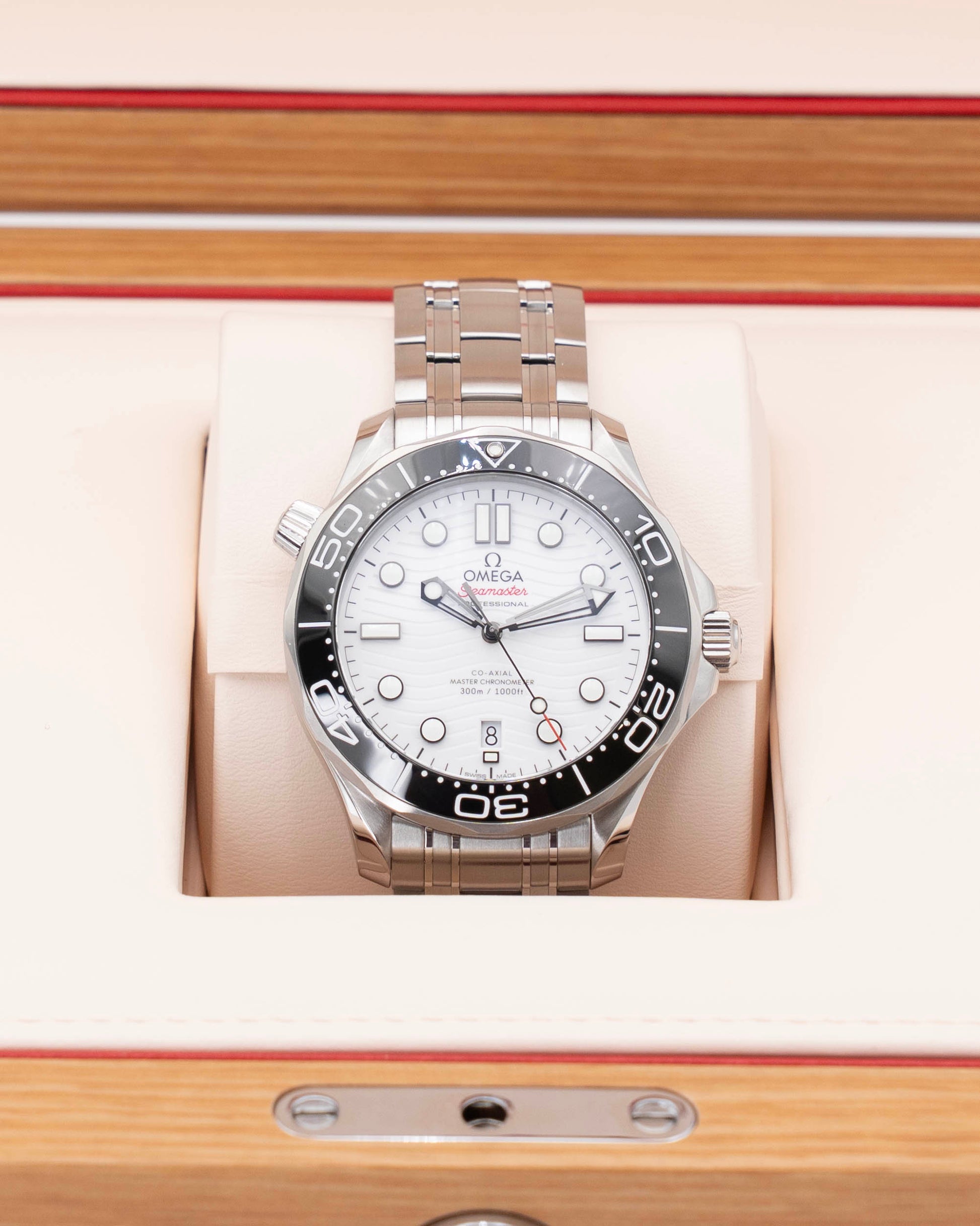 The Omega Seamaster Diver 300M, reference 210.30.42.20.04.001, is a bold and modern dive watch featuring a crisp white dial — a rare and striking choice for the Seamaster line — with a laser-engraved wave pattern and luminous hands and hour markers for excellent legibility. Its 42 mm stainless steel case houses the iconic Seamaster design: a unidirectional rotating bezel with a white ceramic insert, a helium escape valve, and a screw-down crown. The watch is powered by Omega’s Caliber 8800 — a self-winding movement with Co-Axial escapement, Master Chronometer certification, and a 55-hour power reserve — ensuring precision and anti-magnetic resistance.