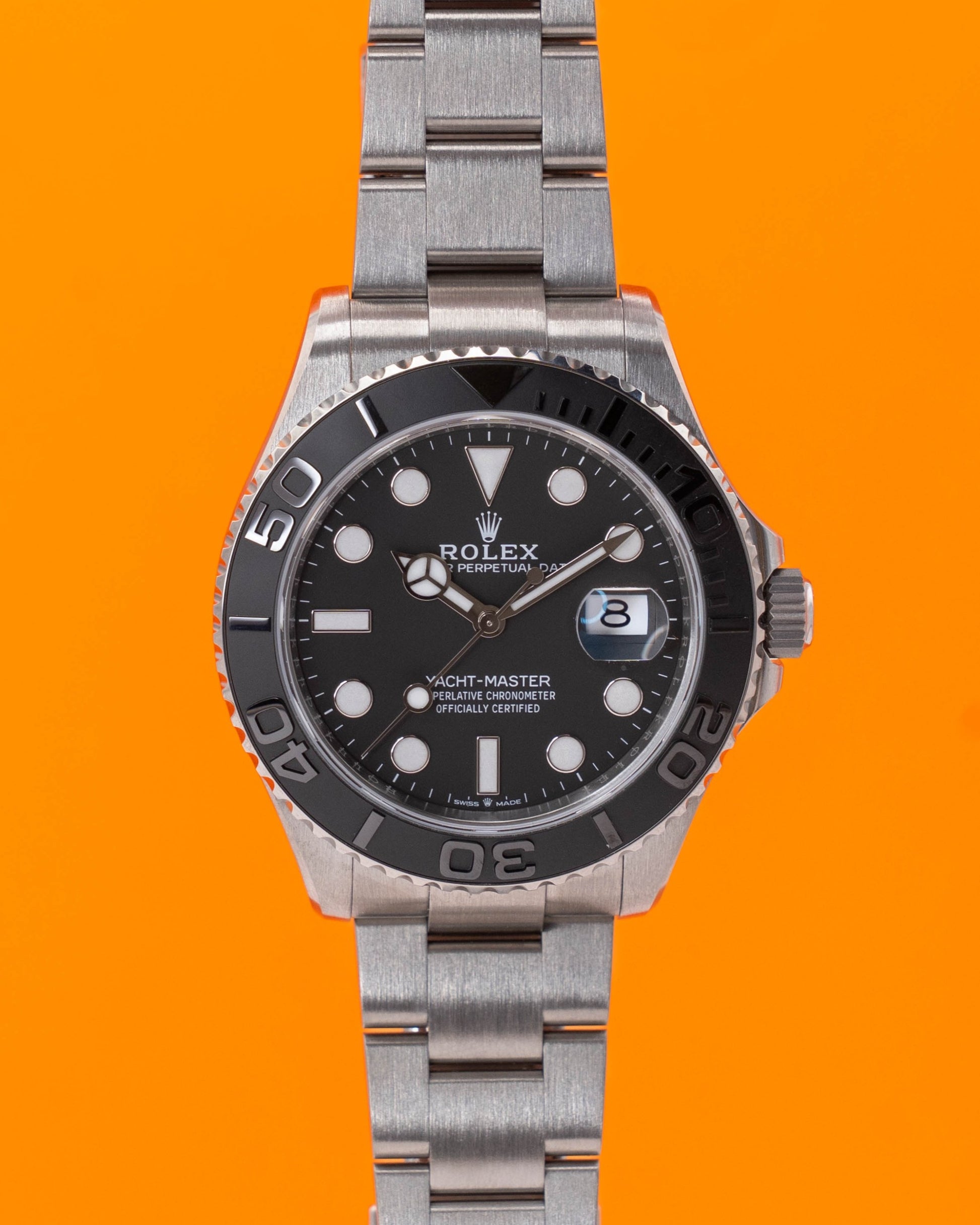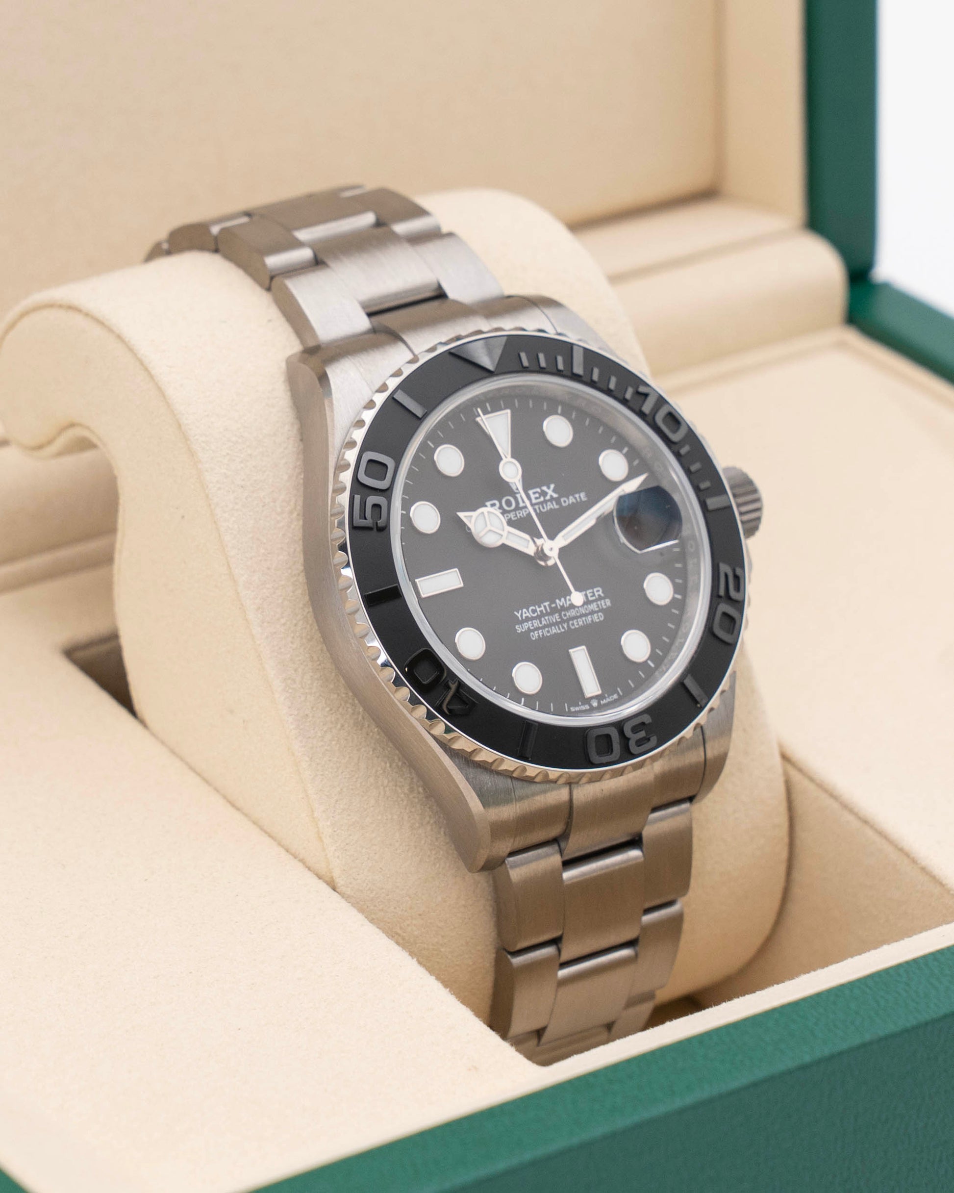 Powered by Rolex's Caliber 3235 — a self-winding movement with a 70-hour power reserve and Chronometer certification — the 226627 delivers exceptional precision and reliability. The titanium Oyster bracelet, with its solid links and Oysterlock clasp, ensures a secure, comfortable fit while remaining significantly lighter than steel. With 100 meters of water resistance, it's well-suited for water sports and maritime activities. Released in 2025, this Yacht-Master 42 stands as a modern icon — perfect for collectors and enthusiasts who value advanced materials, nautical heritage, and Rolex's legendary craftsmanship.