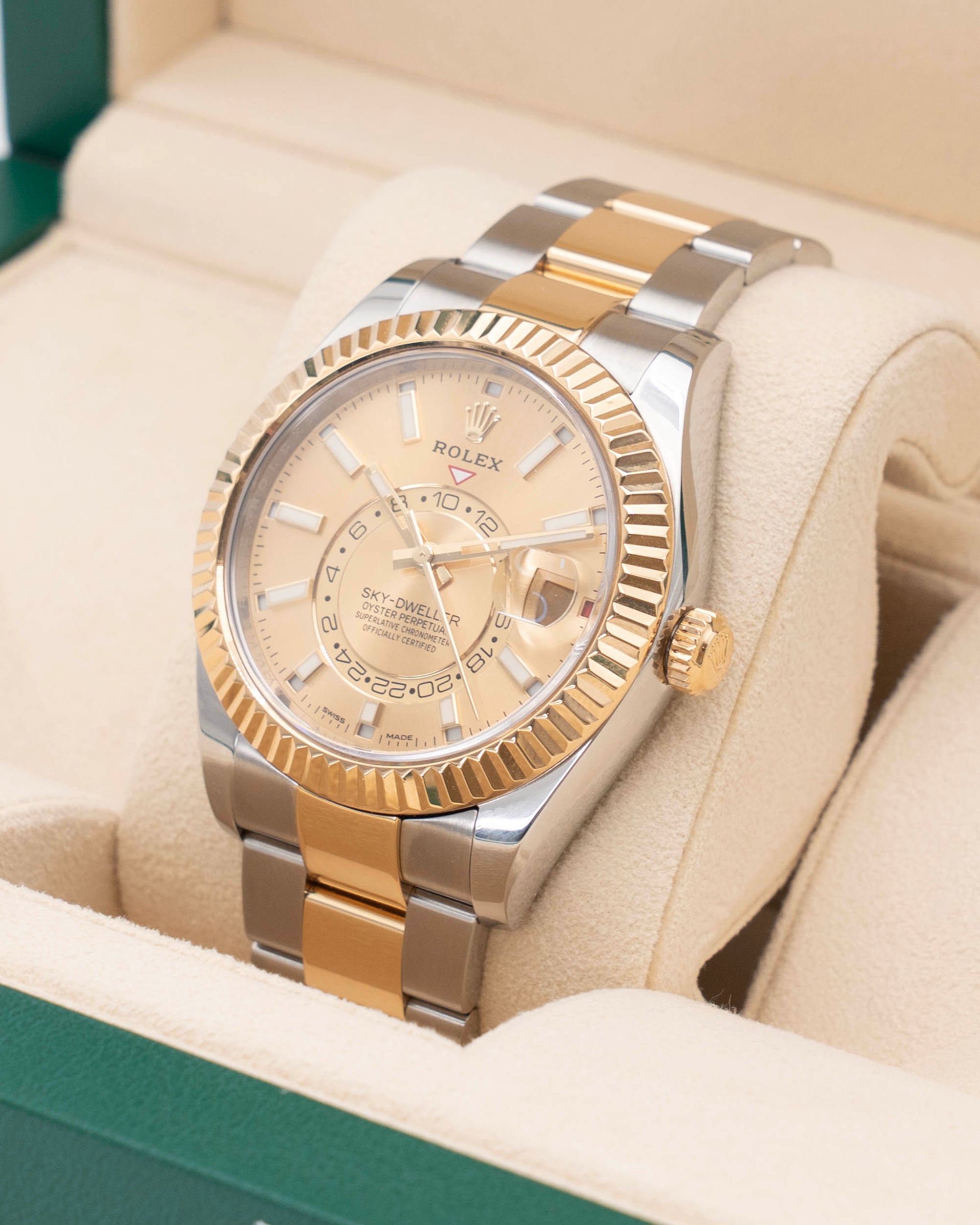 The Rolex Sky-Dweller, reference 326933, is a sophisticated and highly functional annual calendar dual-time watch crafted in Yellow Rolesor (stainless steel and 18K yellow gold) for a bold, elegant aesthetic. Its 42 mm case frames a champagne dial — a warm, refined hue that enhances the watch’s luxurious appeal — with applied hour markers and a 24-hour disc for tracking a second time zone. The annual calendar displays the month, date, and day — all visible through apertures on the dial — with the date magnified by a Cyclops lens at 3 o’clock.