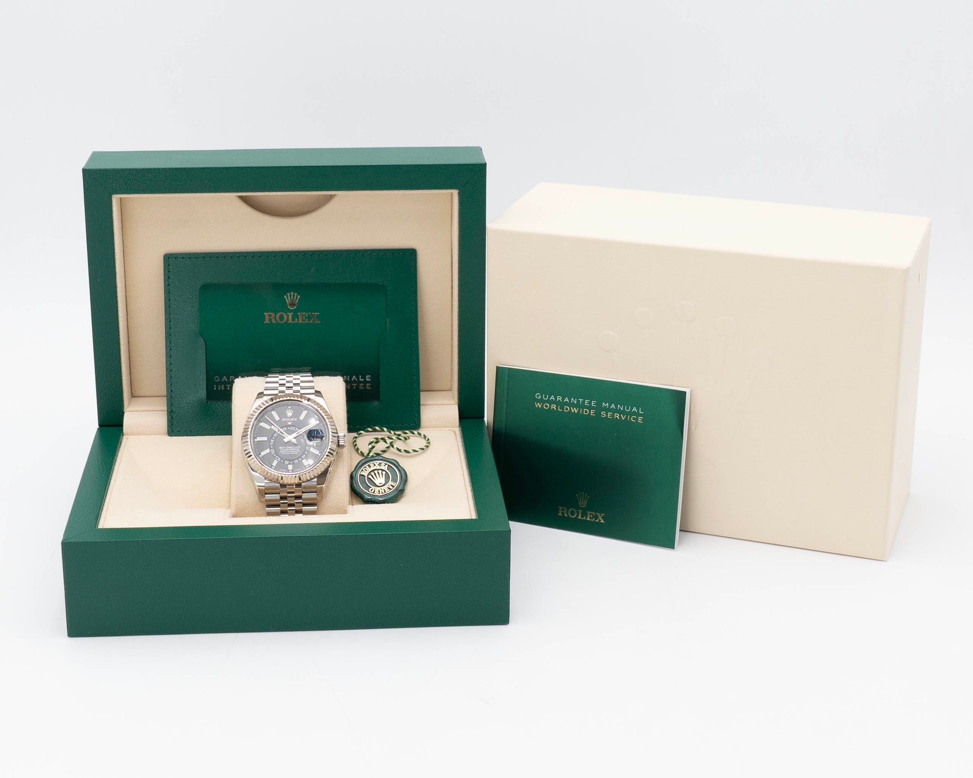 Powered by Rolex’s Caliber 9001 — a self-winding movement with a 72-hour power reserve and Chronometer certification — the 326934 delivers precision and reliability. The Jubilee bracelet, in matching Oystersteel and white gold, ensures a comfortable, secure fit with its five-piece links and Oysterlock clasp. With 100 meters of water resistance, it’s built for everyday elegance and travel. Released in 2022, this Sky-Dweller is a modern classic — perfect for discerning collectors who value innovation, luxury, and Rolex’s legendary craftsmanship.