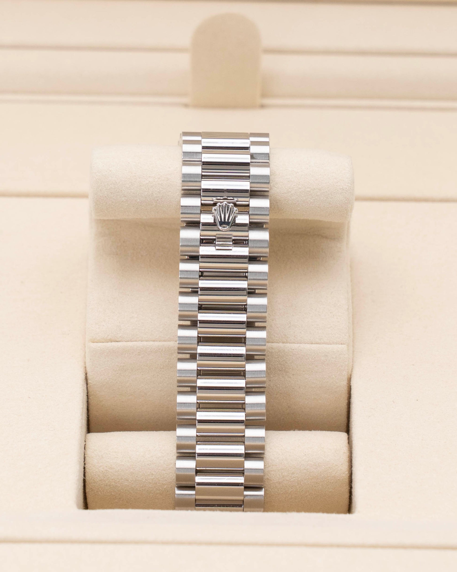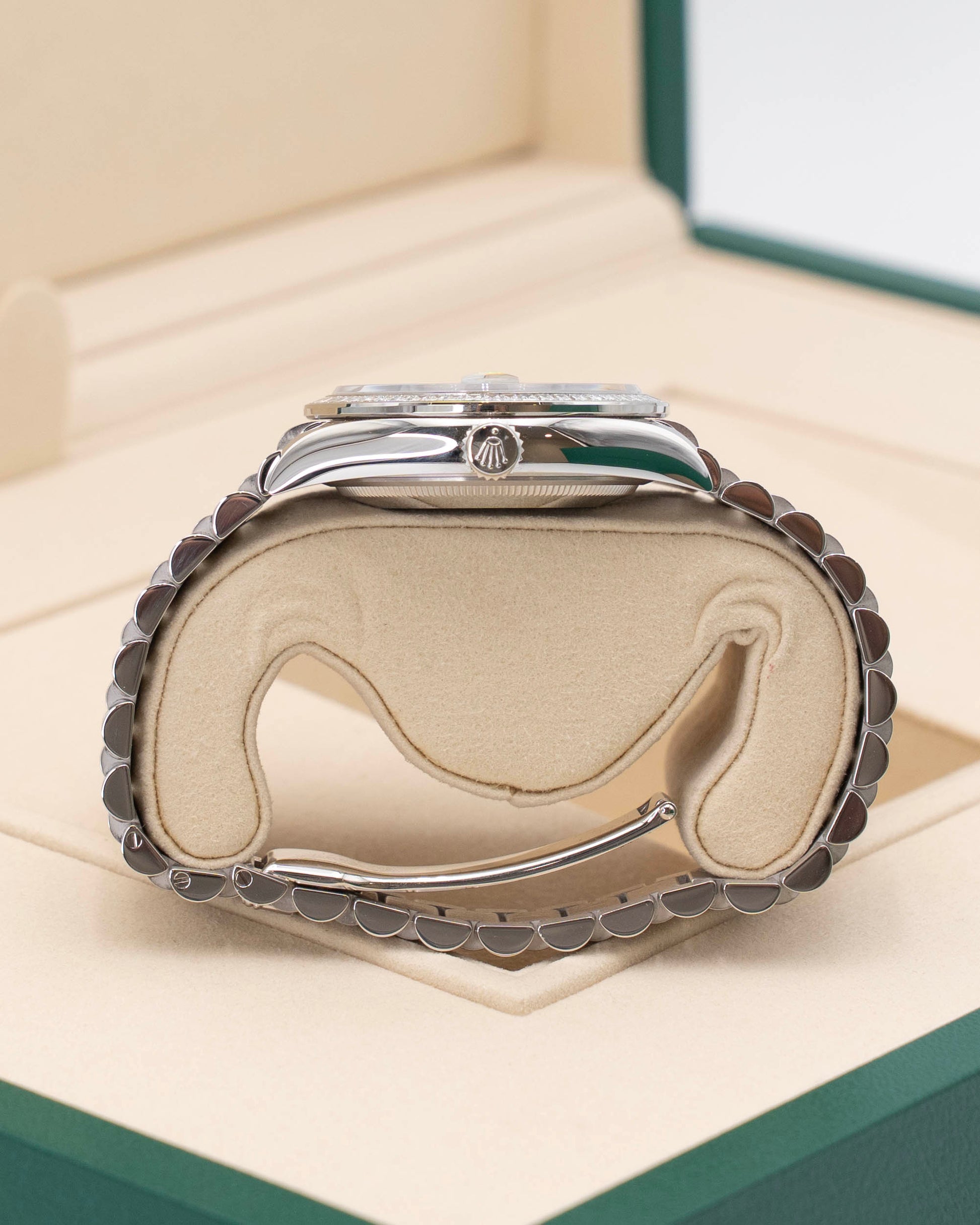 Powered by Rolex’s Caliber 3255 — a self-winding movement with a 70-hour power reserve and Chronometer certification — the 128396TBR delivers exceptional precision and reliability. The platinum President bracelet, with its semi-circular three-piece links and concealed clasp, ensures a secure, comfortable fit. With 100 meters of water resistance, it’s built for elegance, not extreme conditions. As a 2026 unworn model, this Day-Date is a rare and coveted masterpiece — perfect for collectors and connoisseurs who value exclusivity, precious materials, and the fusion of haute horlogerie with haute joaillerie.