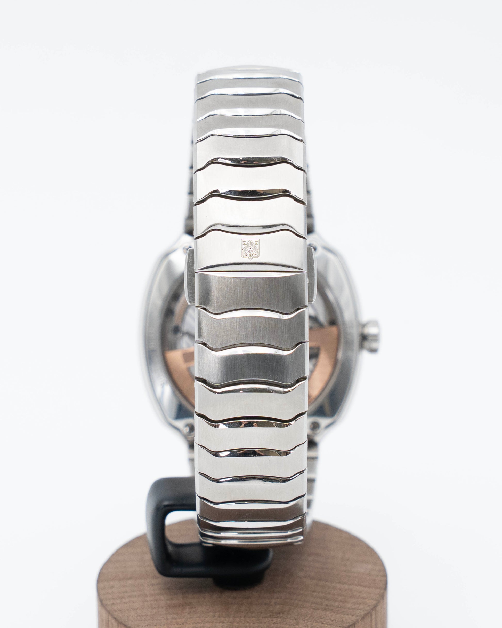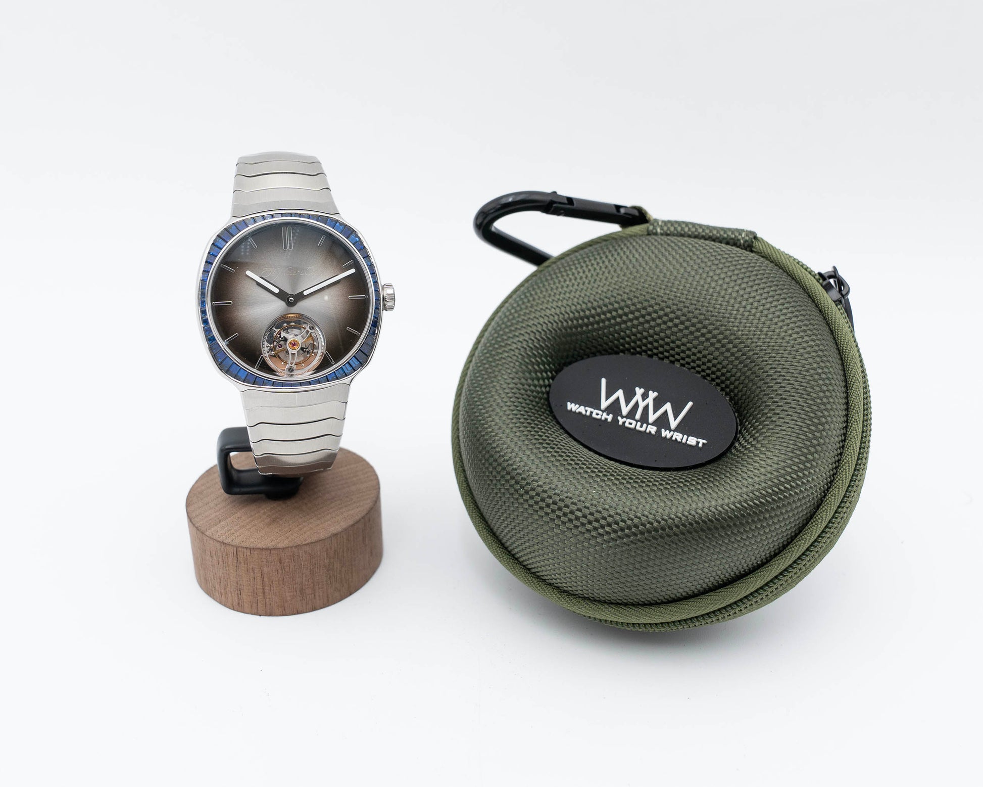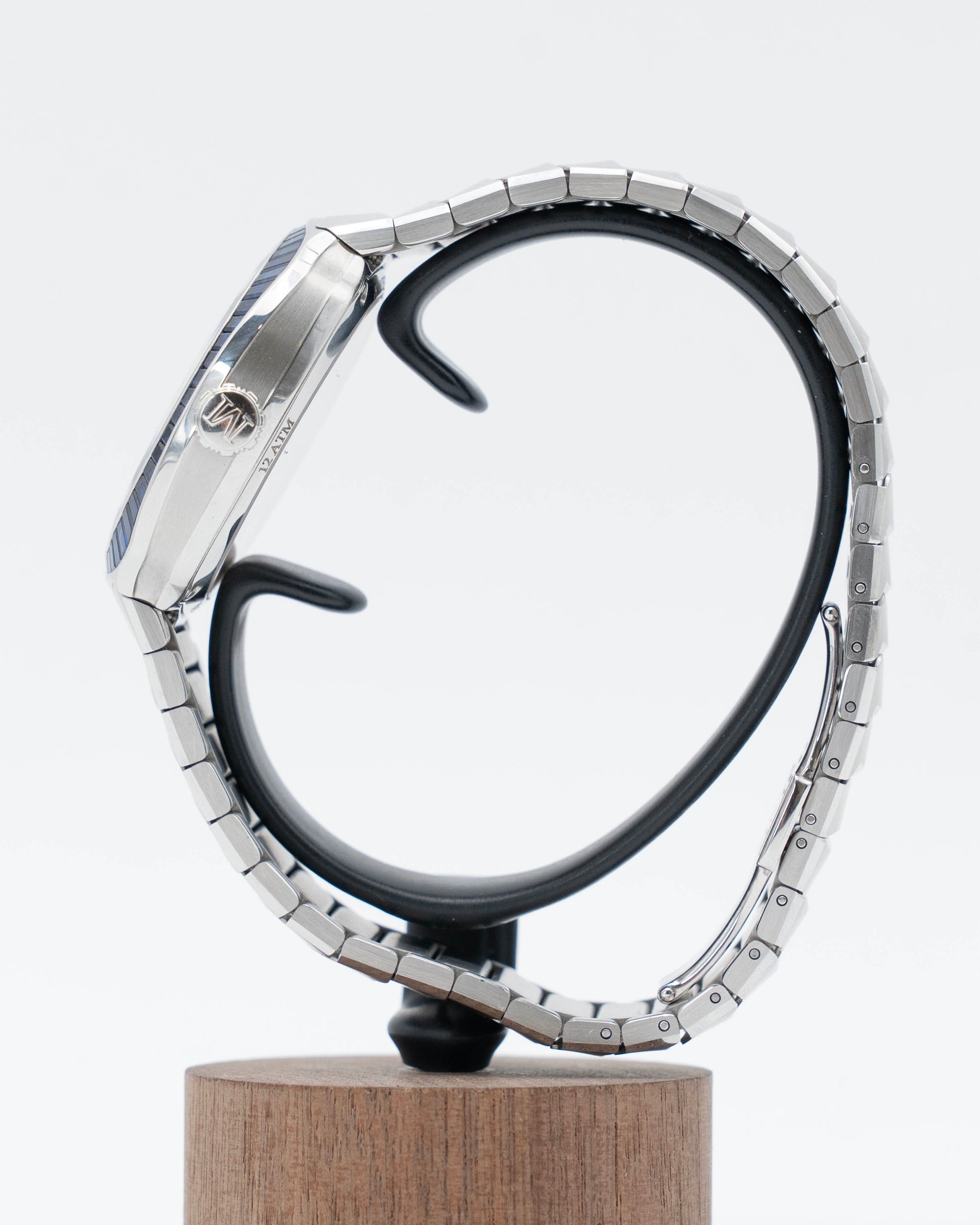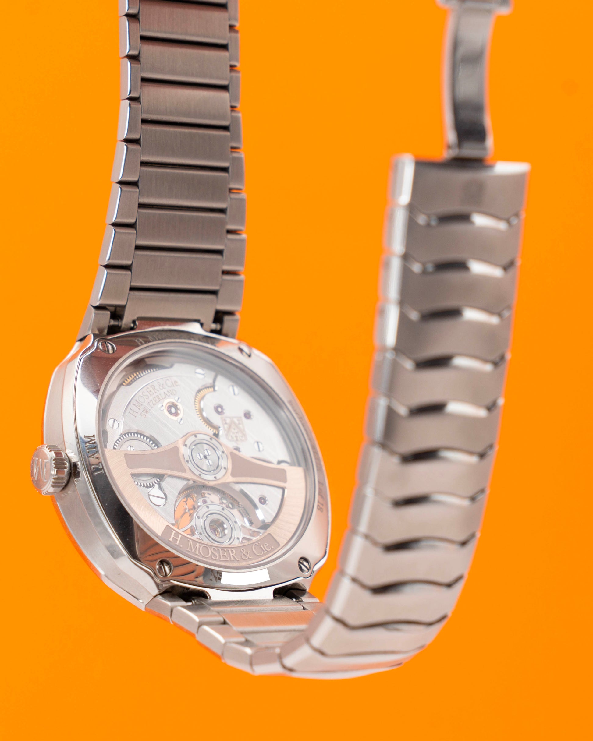 Powered by H. Moser & Cie’s in-house Caliber HMC 804 automatic movement, the Streamliner Tourbillon delivers precision, a 72-hour power reserve, and the brand’s signature minimalist philosophy — no logo, no indices, just pure dial and mechanics. The integrated stainless steel bracelet enhances its sleek, modern silhouette, offering comfort and a seamless look. As a limited collaboration with Bucherer, this Streamliner Tourbillon stands as a statement of contemporary luxury — perfect for collectors and connoisseurs who value innovation, understated sophistication, and the fusion of cutting-edge design with haute horlogerie.
