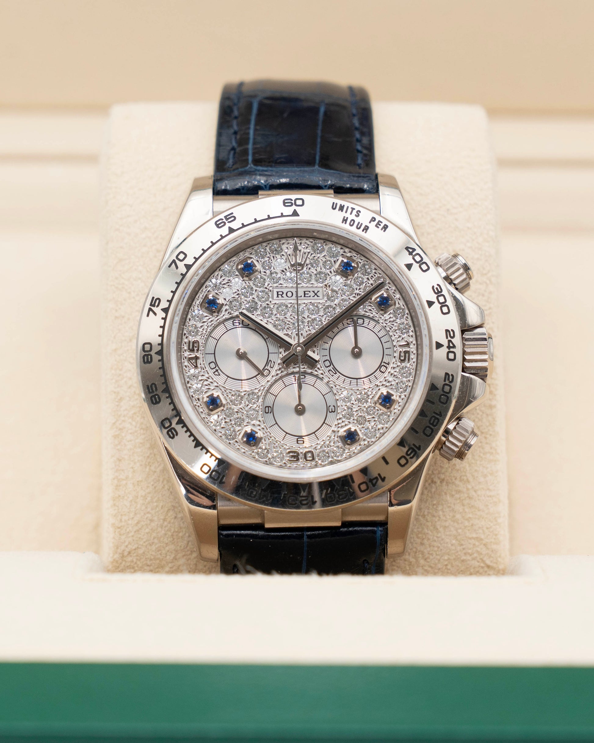 | Model Name | Rolex Cosmograph Daytona 40mm 16519 Factory Pave and Sapphire Dial White Gold 1999 papers |