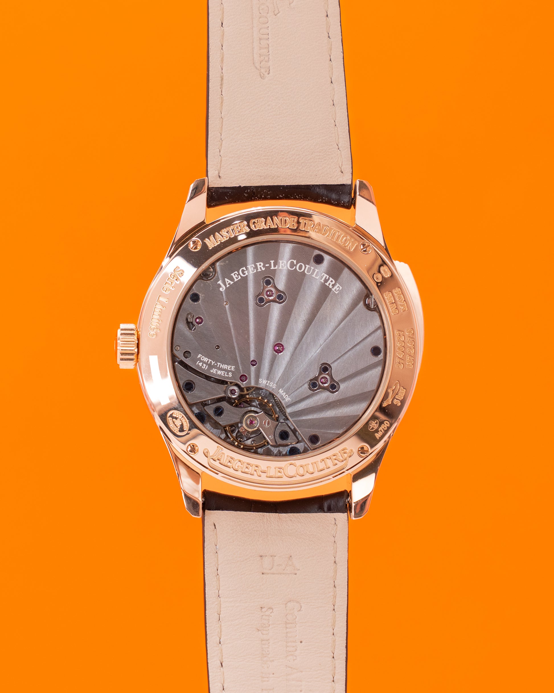 Powered by JLC's Caliber 947 — a manual-wind movement with a 45-hour power reserve — the watch delivers both visual and acoustic excellence, with a cathedral gong system that produces a rich, resonant tone. The alligator/crocodile strap, with a rose gold folding clasp, ensures a refined, comfortable fit for formal occasions. With 5 bar (50 meters) of water resistance, it's built for elegance, not active use. As a limited edition of just 100 pieces, this Master Grande Tradition is an extraordinary collector's piece — perfect for connoisseurs who value mechanical complexity, precious materials, and the rare artistry of a minute repeater.