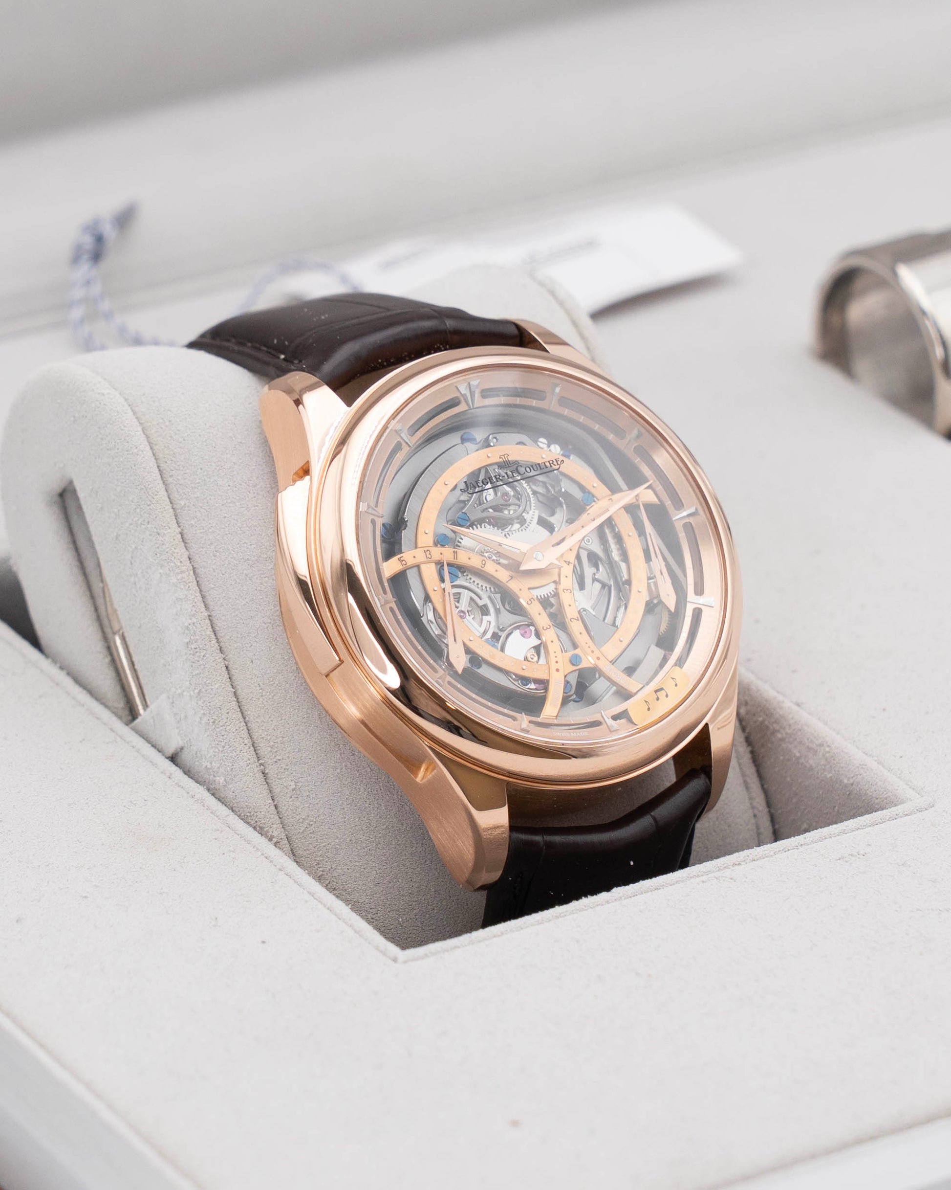 The Jaeger-LeCoultre Master Grande Tradition, reference Q5012550, is an extraordinarily rare and prestigious timepiece — one of only 100 pieces ever produced — representing the pinnacle of JLC's horological mastery. Its 44 mm case, crafted in 18K rose gold, houses a breathtaking skeletonized dial that reveals the intricate mechanics of the Caliber 947 — a hand-wound minute repeater movement that chimes the hours, quarter hours, and minutes on demand, producing a melodious acoustic performance. The open-worked architecture showcases the movement's bridges, gears, and striking mechanism with exceptional finishing and artistry.