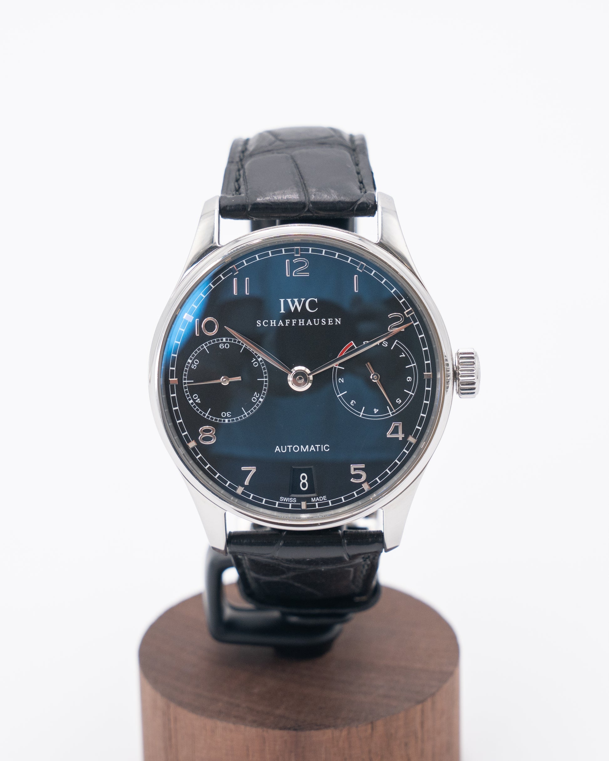 The IWC Portugieser Automatic 5007 (Ref. IW5007-03) is a distinguished timepiece that combines classic elegance with technical sophistication. Housed in a 42.3 mm stainless steel case, this model features a striking black dial adorned with Arabic numerals and a railway-track-style chapter ring, paying homage to the heritage of marine chronometers. The sleek case is complemented by a luxurious alligator leather strap, enhancing the watch’s refined aesthetic.