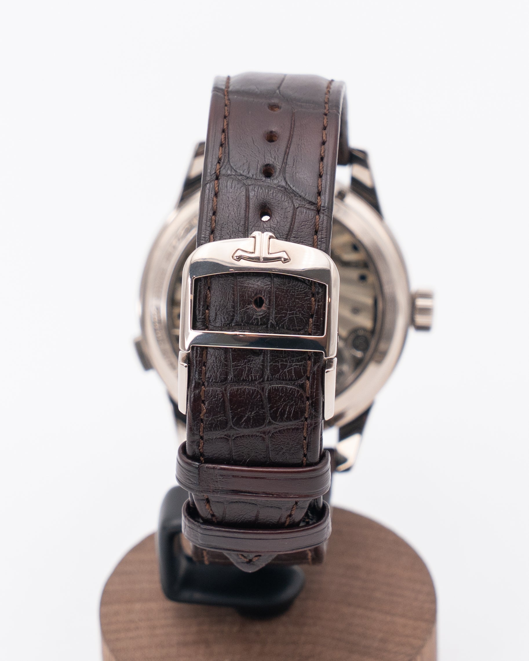 The Jaeger-LeCoultre Duomètre Quantième Lunaire Q6043420 is a showcase of the brand’s horological mastery, crafted in a 40.5 mm white gold case that exudes refined elegance. Its silver dial is meticulously detailed, featuring off-centered hours and minutes, a moon phase display, date indication, and a striking dual-wing layout that reflects the innovative mechanical concept at its core. Paired with a finely finished leather strap, the watch balances classical charm with avant-garde watchmaking, offering a piece that is as technically fascinating as it is aesthetically harmonious.
