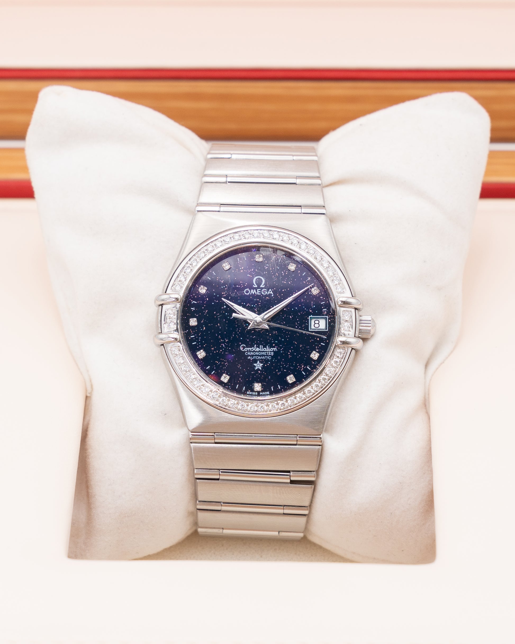 The Omega Constellation 36mm 131.15.36.20.53.001 captures the timeless elegance of the Constellation line while introducing a captivating modern flair. Its stainless steel 36mm case is adorned with the collection’s signature claws and an aftermarket diamond bezel, offering a radiant frame that accentuates the deep aventurine dial. The dial’s shimmering blue tones evoke a night sky filled with stars, perfectly complemented by polished hands and hour markers that enhance legibility and luxury alike. The sapphire crystal protects the intricate details within, maintaining both clarity and durability over time.