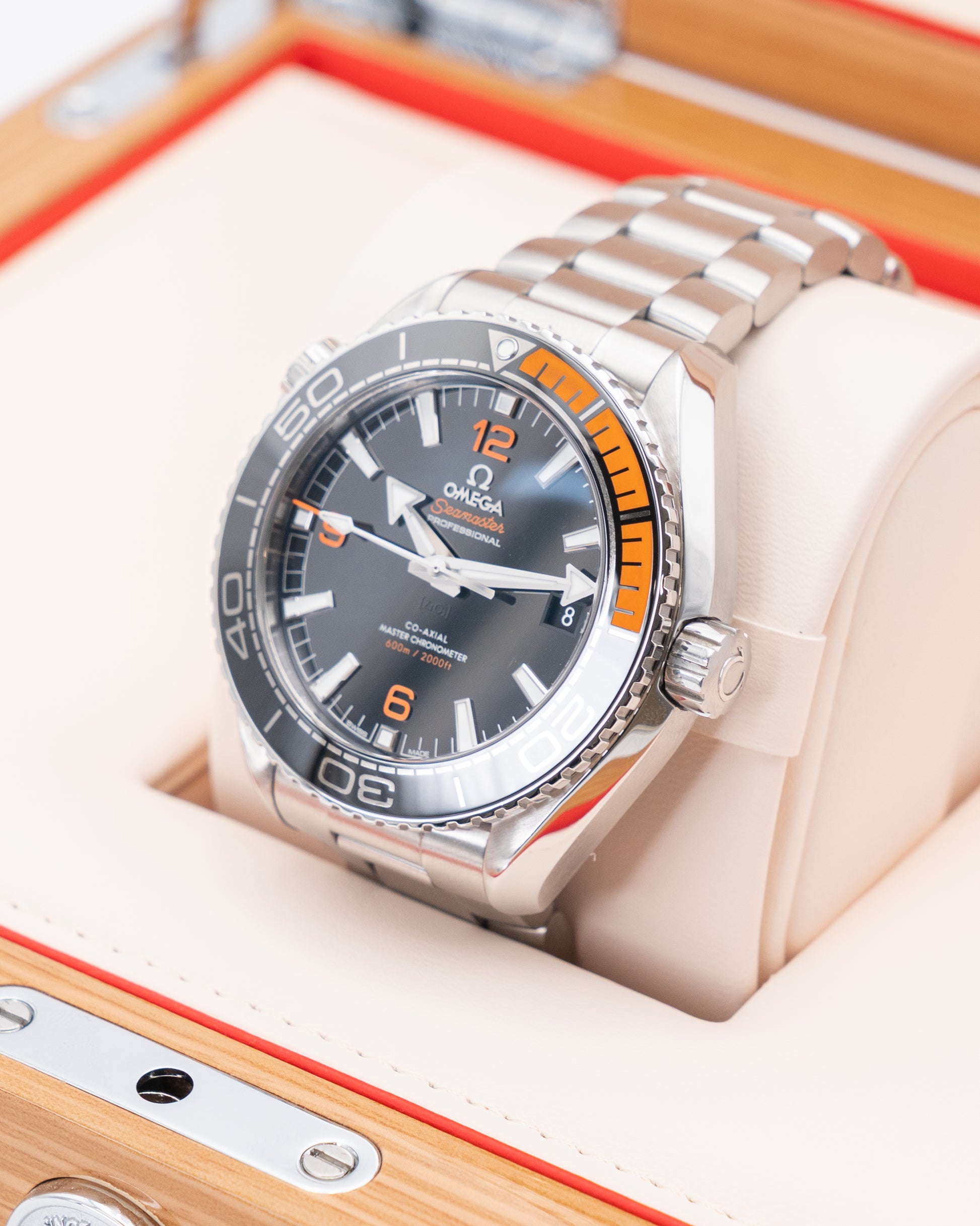 The Omega Seamaster Planet Ocean 600M Co-Axial Master Chronometer (Ref. 215.30.44.21.01.002) is a bold expression of Omega’s deep-sea heritage and technical mastery. Its 43.5 mm stainless steel case exudes strength and refinement, paired with a striking black ceramic dial highlighted by vivid orange accents that evoke the spirit of ocean exploration. The unidirectional orange ceramic bezel adds a distinctive touch of color while ensuring precision during dives. Completed with a polished and brushed stainless steel bracelet, the watch delivers both comfort and rugged elegance suited for any environment.