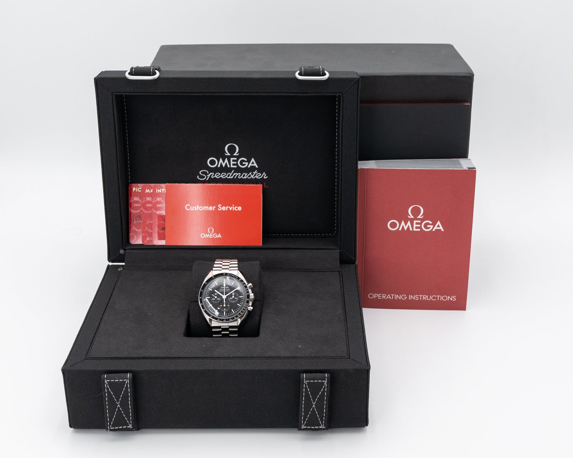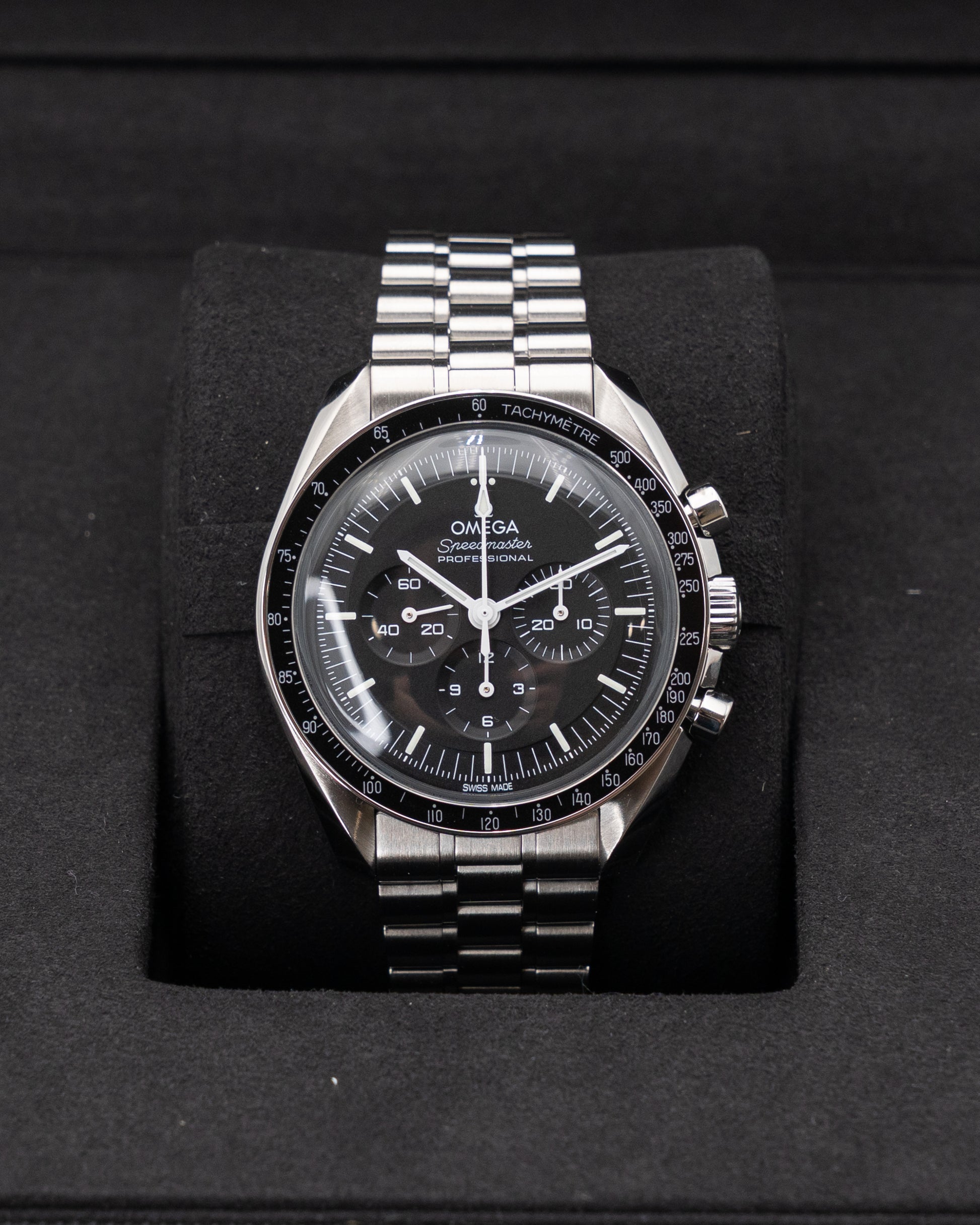 he Omega Speedmaster Moonwatch ref. 310.30.42.50.01.001 stands as a legendary timepiece, deeply intertwined with the history of space exploration. Crafted from stainless steel, its 42mm case maintains the timeless proportions of the original Moonwatch worn by Apollo astronauts. The black dial, accented with luminous hands and hour markers, delivers exceptional readability and features the iconic tri-compax layout, including small seconds, 30-minute, and 12-hour chronograph counters. The hesalite crystal, reminiscent of vintage models, adds a touch of authenticity and historical charm.