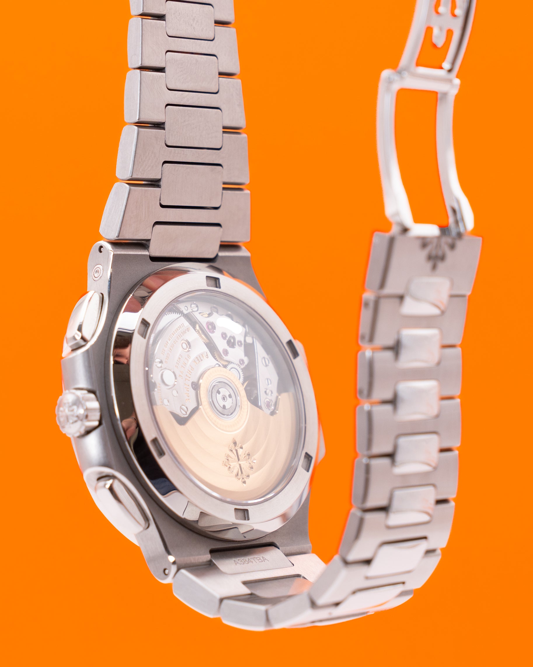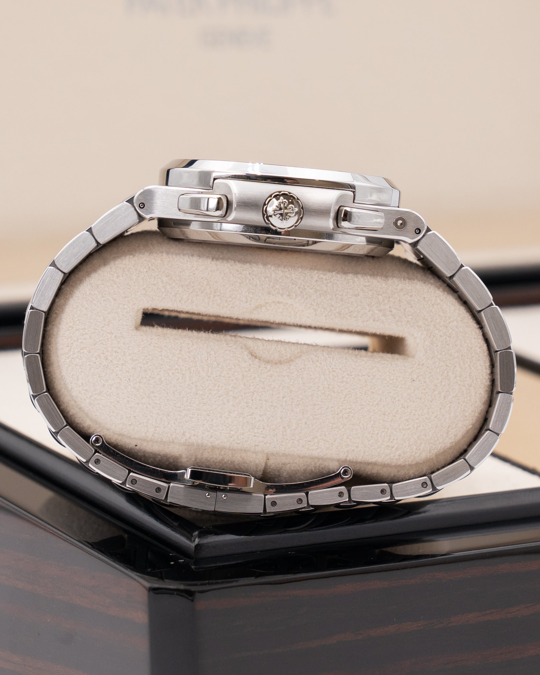 Inside, the watch is powered by the Patek Philippe Caliber CH 28-520 C FUS, a self-winding flyback chronograph movement that seamlessly combines traditional craftsmanship with modern engineering. The patented dual time zone system allows for effortless adjustment, while the flyback function ensures precise timing on demand. With a robust water resistance of 120 meters, the 5990/1A-011 balances everyday usability with high horology prestige, making it one of the most versatile and coveted Nautilus models in Patek Philippe’s esteemed collection.