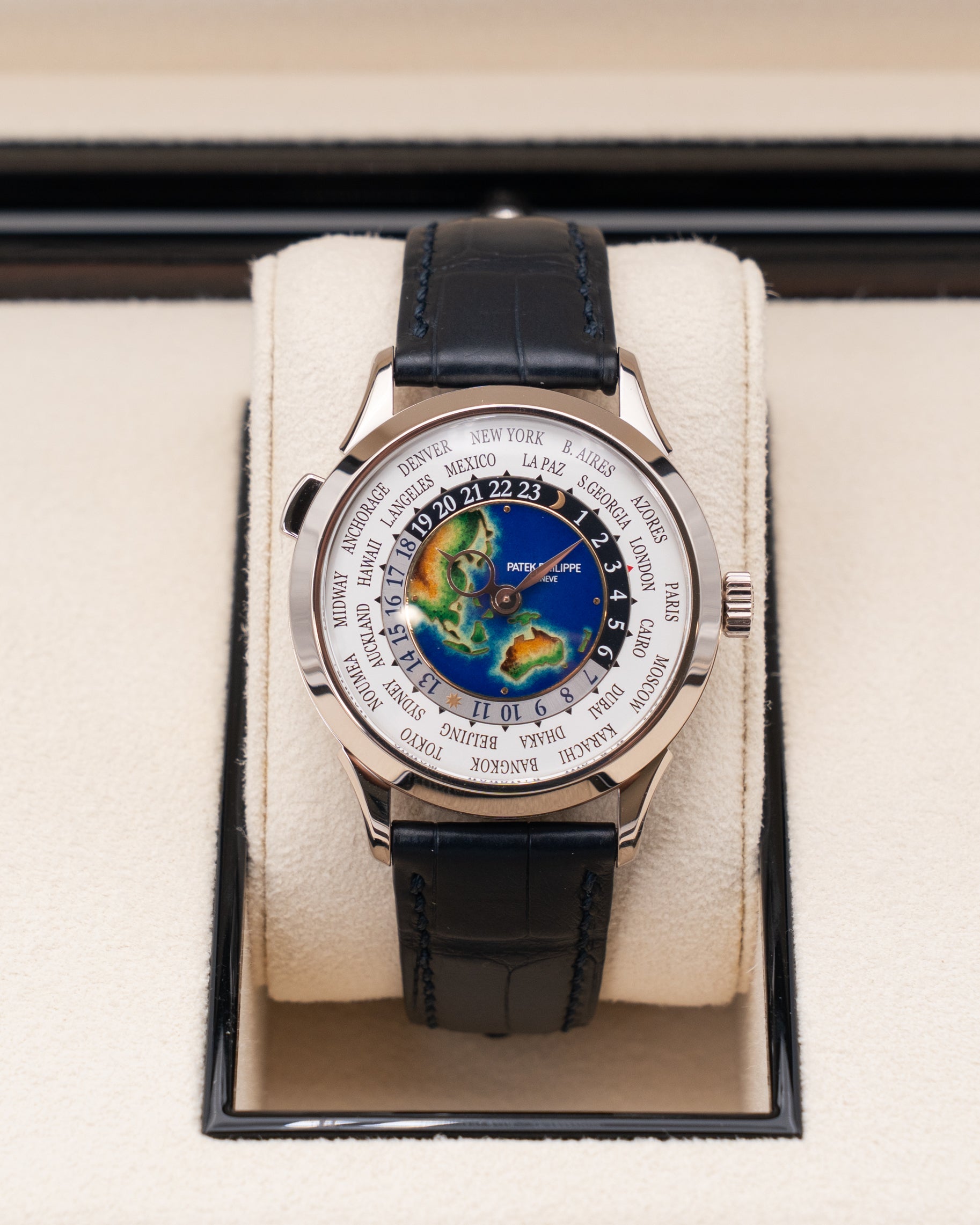 The Patek Philippe World Time 5231G-001 is a masterpiece of haute horlogerie that beautifully merges artistry and technical ingenuity. Crafted in 18k white gold with a 38.5 mm case, this timepiece radiates understated sophistication. Its centerpiece is the handcrafted cloisonné enamel dial, depicting a colorful world map — a signature tribute to the art and heritage of Patek Philippe’s world time watches. Surrounding the enamel center is a city ring and 24-hour scale, enabling the wearer to read the time simultaneously across all major time zones, a feat of mechanical elegance and precision.