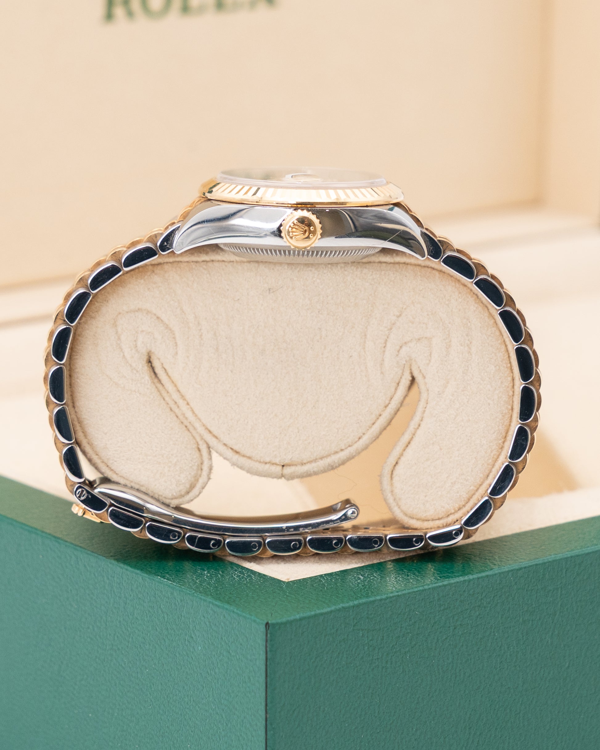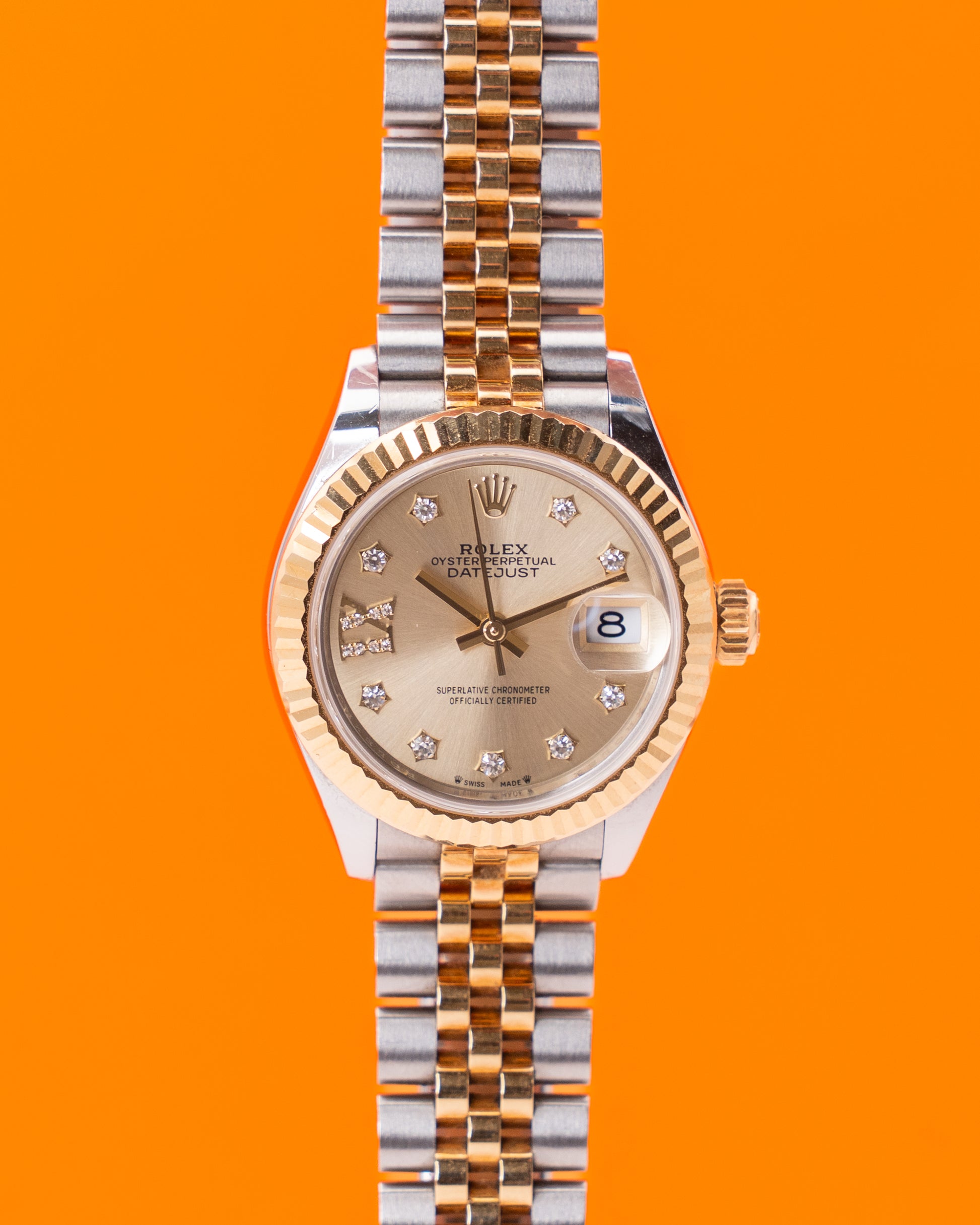 The Rolex Lady-Datejust 28 reference 279173-0021 embodies timeless femininity and precision craftsmanship, blending elegance with technical excellence. Crafted from a harmonious combination of stainless steel and 18K yellow gold, its 28 mm case features a fluted bezel that catches the light with signature Rolex brilliance. The champagne dial exudes warmth and sophistication, adorned with diamond hour markers set in gold surrounds that elevate its luxurious appeal. The classic Jubilee bracelet adds refinement and comfort, completing a design that is both graceful and enduring.