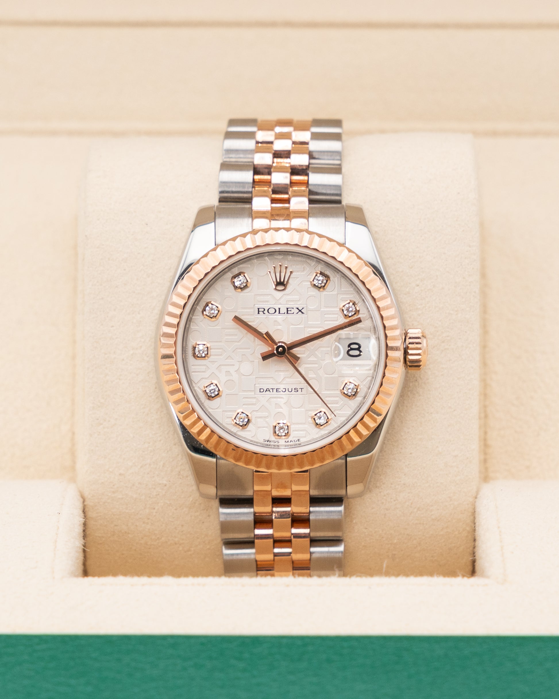 Rolex Datejust 31mm 178271 Silver Rolex Motif Diamond Dial Fluted Jubilee Two Tone Rose Gold