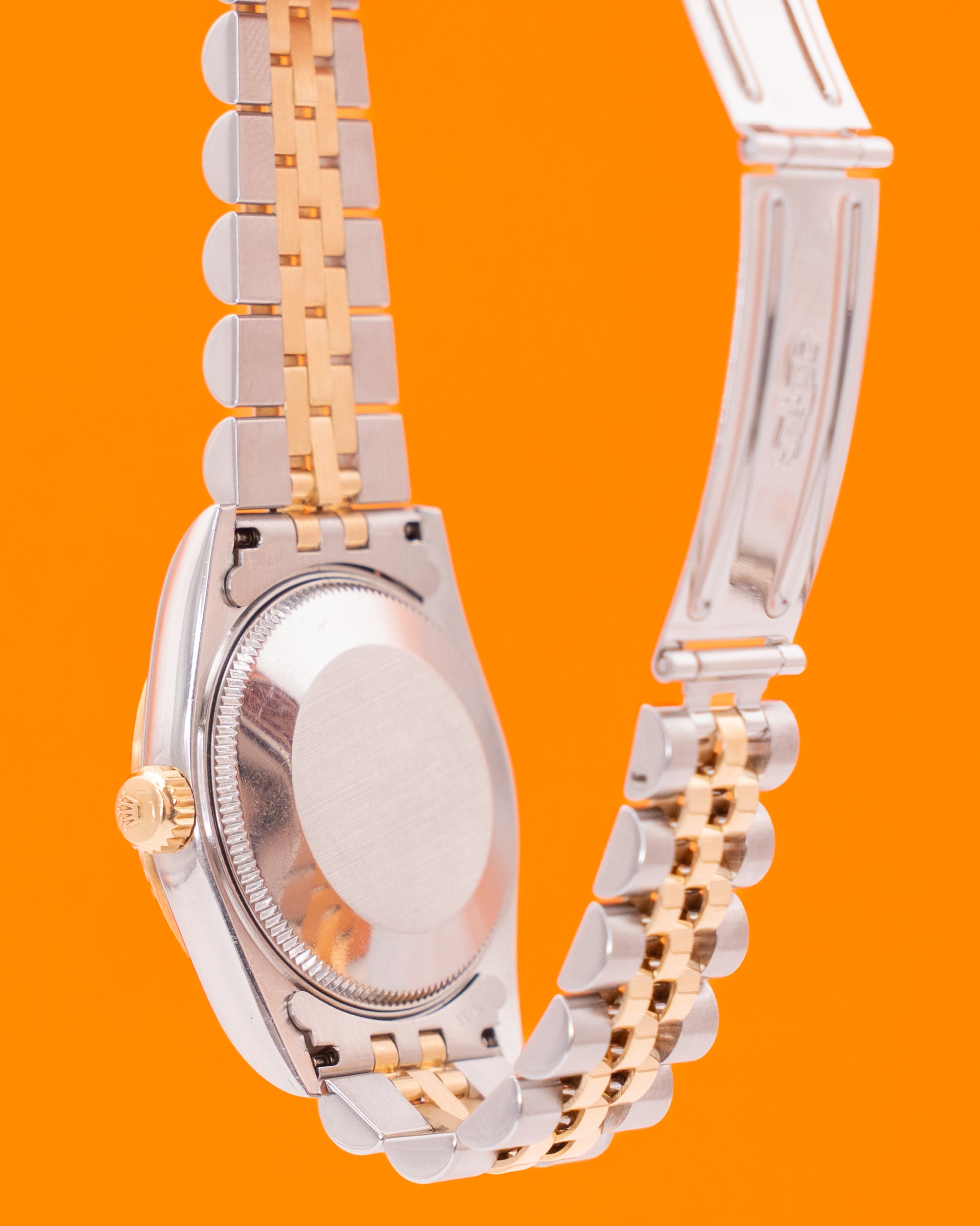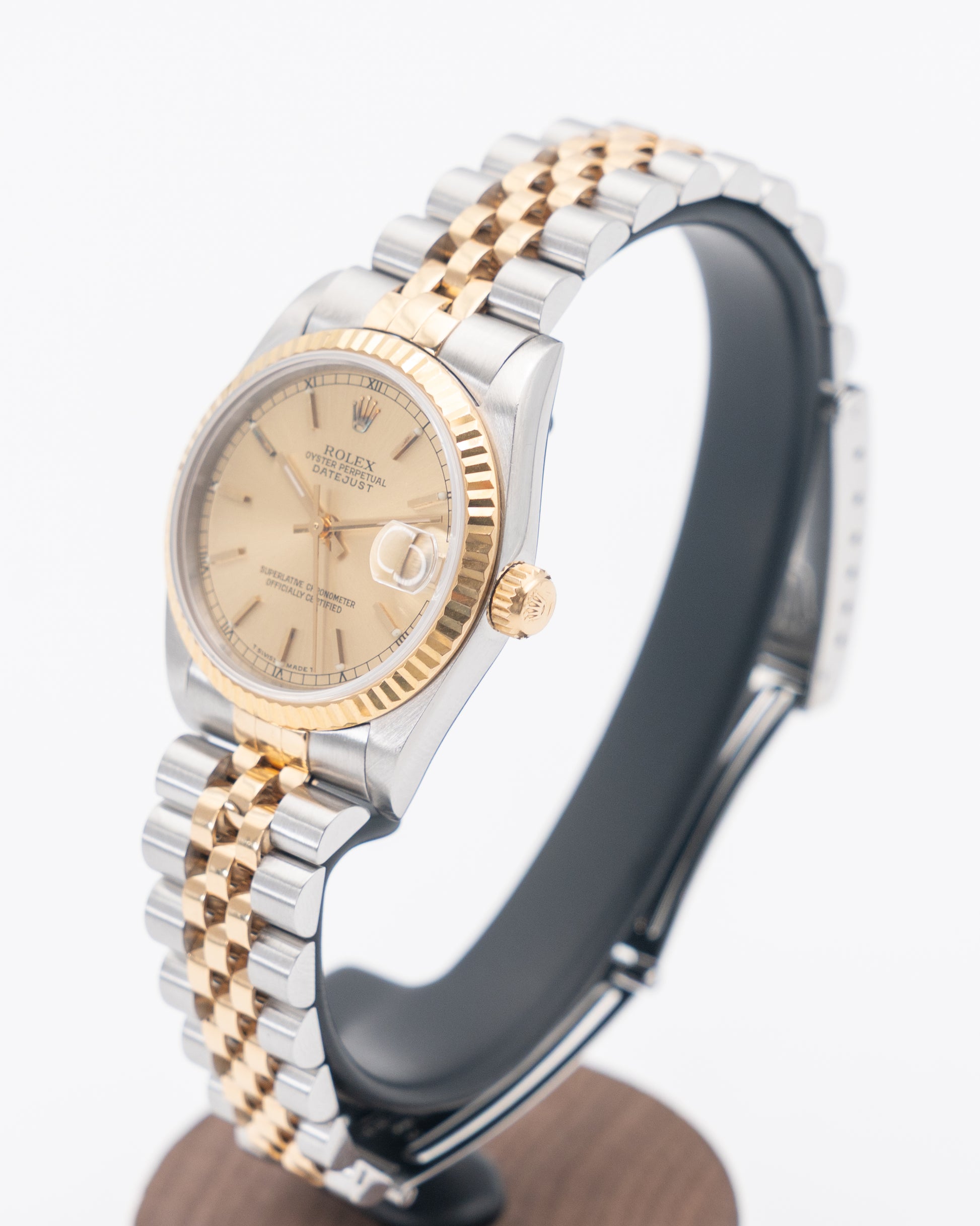The Rolex Datejust (model 68273 CIJ) is a refined midsize timepiece that blends classic Rolex design with a touch of understated luxury. Measuring 31mm, the case is crafted from a combination of stainless steel and yellow gold—commonly known as Rolesor—offering both resilience and elegance. The champagne dial radiates warmth and sophistication, complemented by gold hour markers and the signature date window at 3 o'clock, magnified by the Cyclops lens for easy reading.