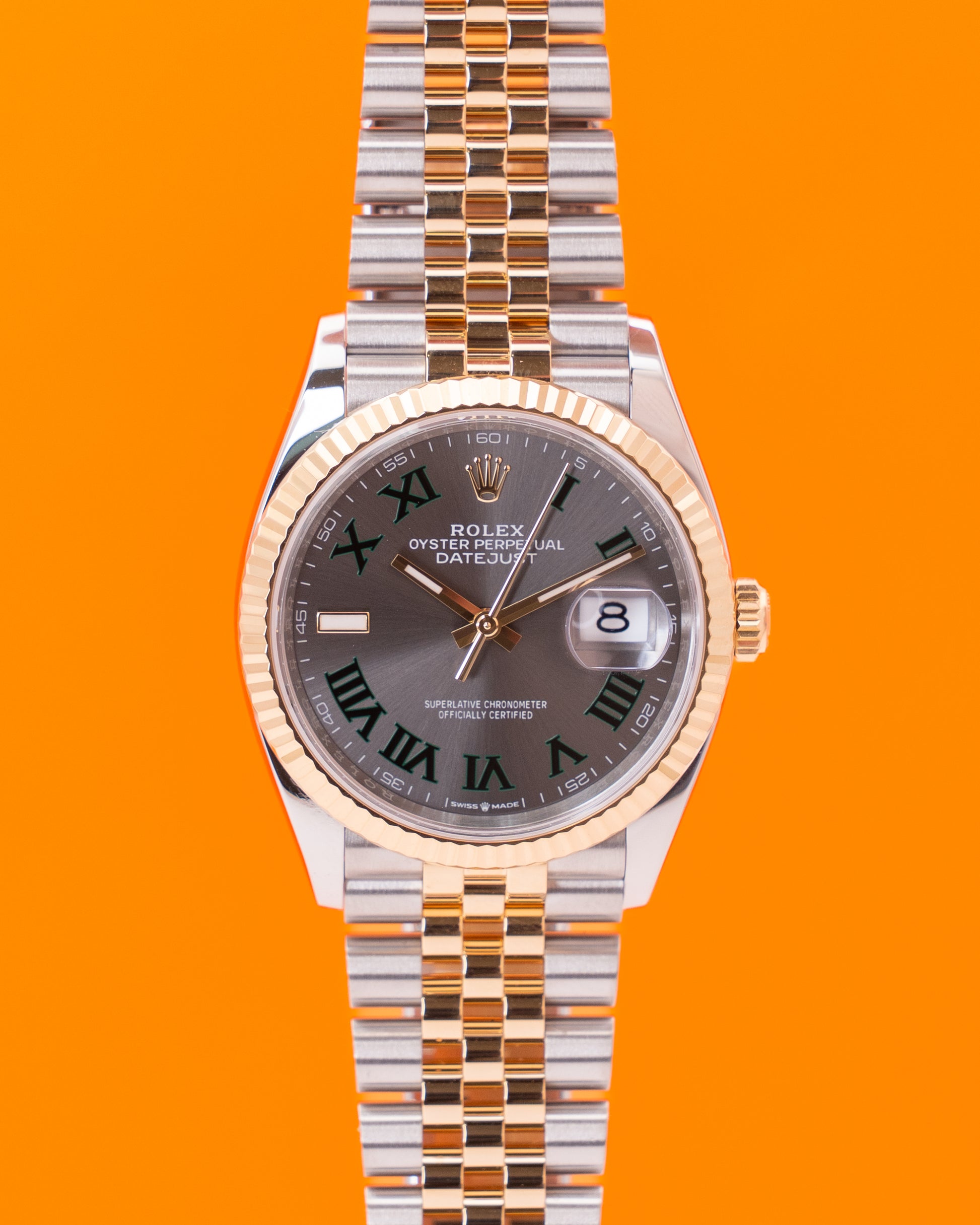 The Rolex Datejust 36 ref. 126233-0035 is a stunning example of classic luxury blended with modern refinement. Its 36 mm Oyster case, crafted from a mix of robust Oystersteel and radiant 18K yellow gold, strikes the perfect balance between strength and sophistication. The slate grey dial adds a contemporary touch, complemented by elegant gold hour markers and the signature Cyclops lens over the date window for easy legibility. This versatile aesthetic makes the watch equally suitable for formal occasions and daily wear, embodying timeless Rolex style.