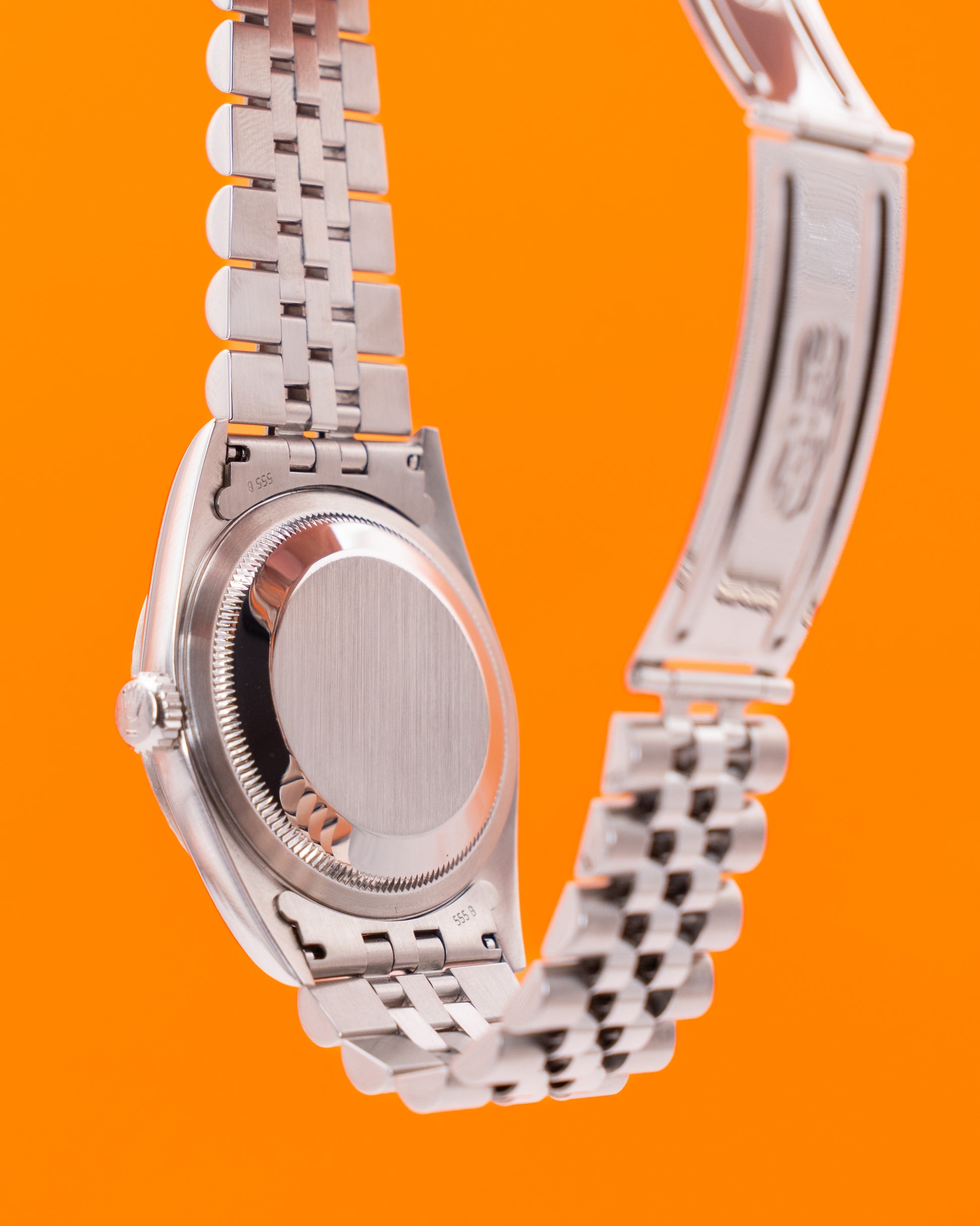 The Rolex Datejust 36 (ref. 16234) is a timeless expression of elegance and precision, crafted in durable stainless steel with a classic 36mm case that makes it an ideal unisex choice. Its striking black dial offers a bold contrast, highlighted by luminous hands and hour markers for enhanced legibility, while the signature date display with Cyclops lens at 3 o’clock provides practicality and iconic Rolex styling. The watch is complemented by the refined Jubilee bracelet, known for its comfort and sophisticated design, which enhances its presence on the wrist.