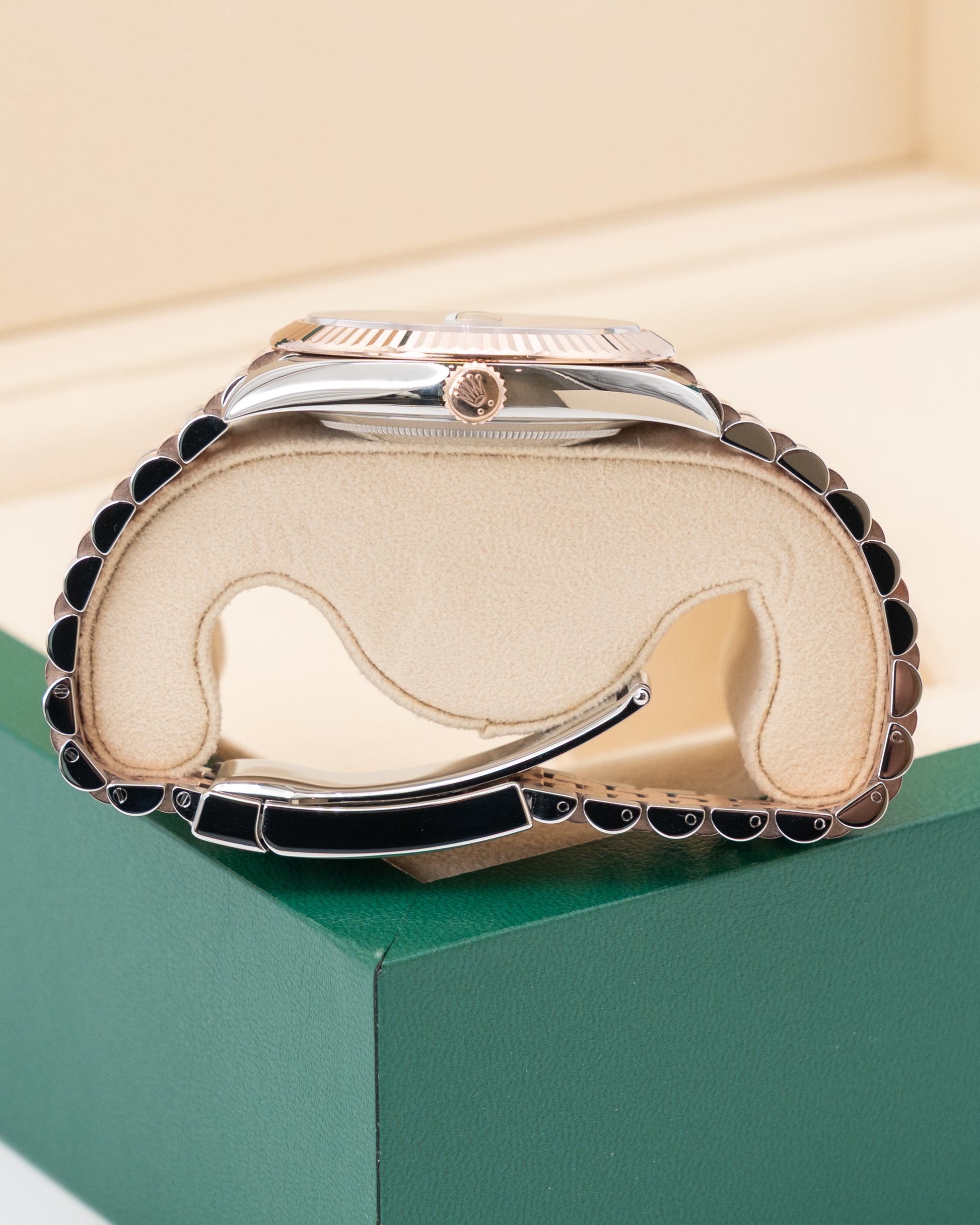 Inside, the watch is powered by the Rolex caliber 3235, a self-winding mechanical movement with superior precision, reliability, and a power reserve of approximately 70 hours. With a water resistance of 100 meters, the Datejust 41 is as practical as it is refined, seamlessly transitioning from everyday wear to formal occasions. A hallmark of Rolex craftsmanship, this Rolesor Everose Datejust stands as both a technical achievement and a symbol of enduring elegance.