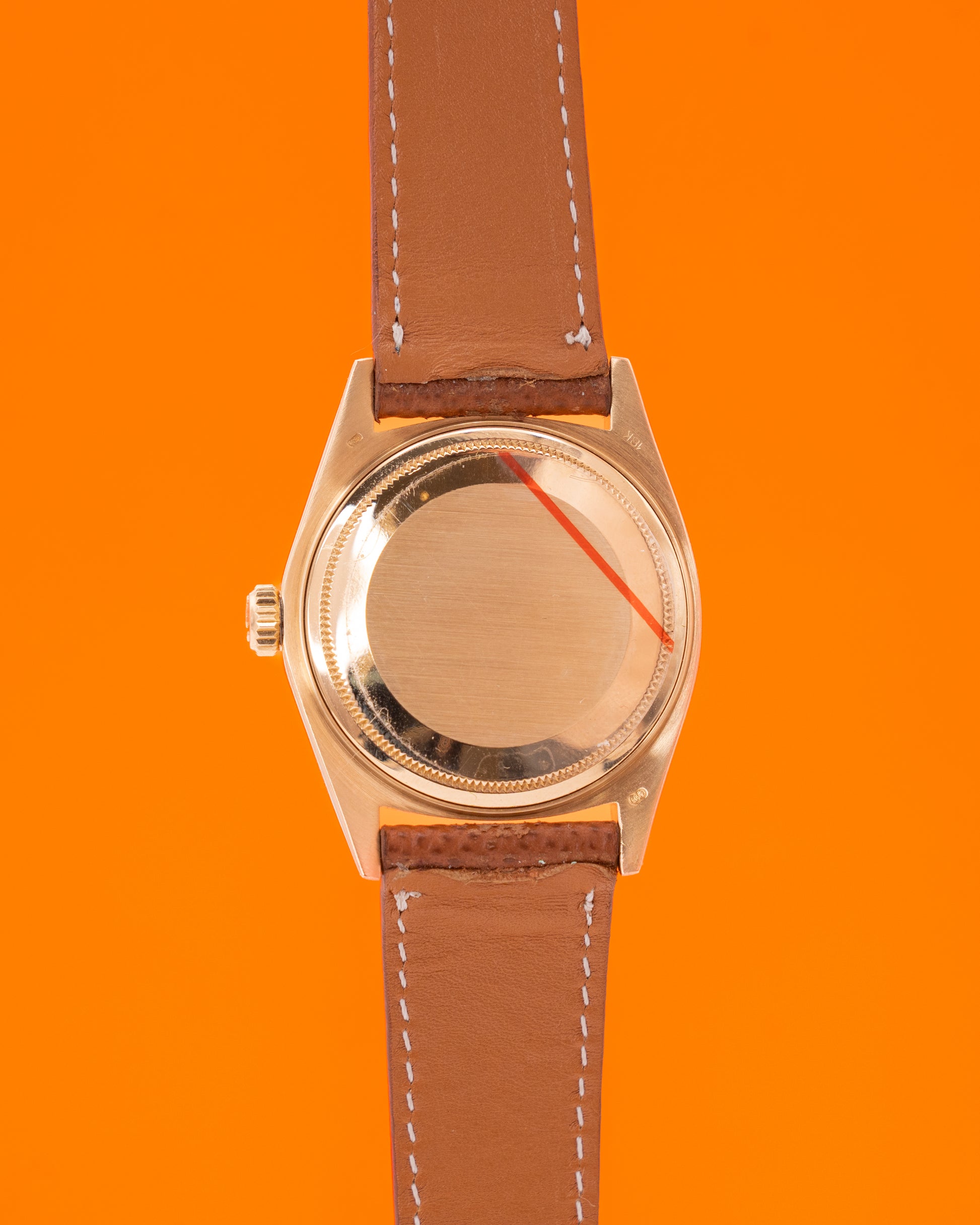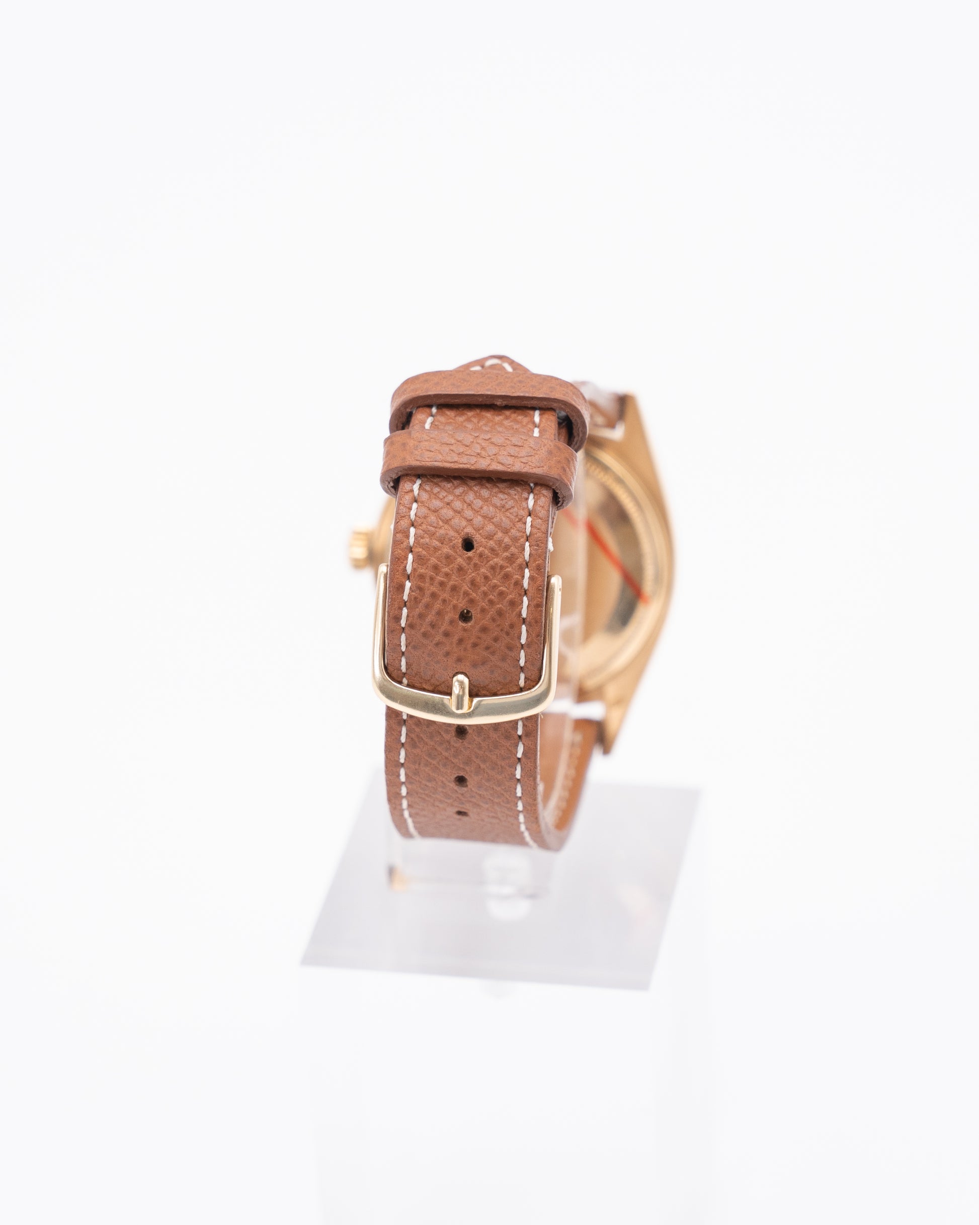 The Rolex Day-Date 18038 is a prestigious and refined timepiece that epitomizes luxury and elegance. Crafted from 18k yellow gold, the 36mm case is both timeless and sophisticated, making it an ideal watch for formal occasions or daily wear. The brown dial adds a distinctive and rich contrast to the golden case, further enhanced by the signature gold hour markers and hands. The Day-Date complication—displaying both the day of the week and date—adds practicality to this classic design, with the day display at 12 o'clock and the date at 3 o'clock.