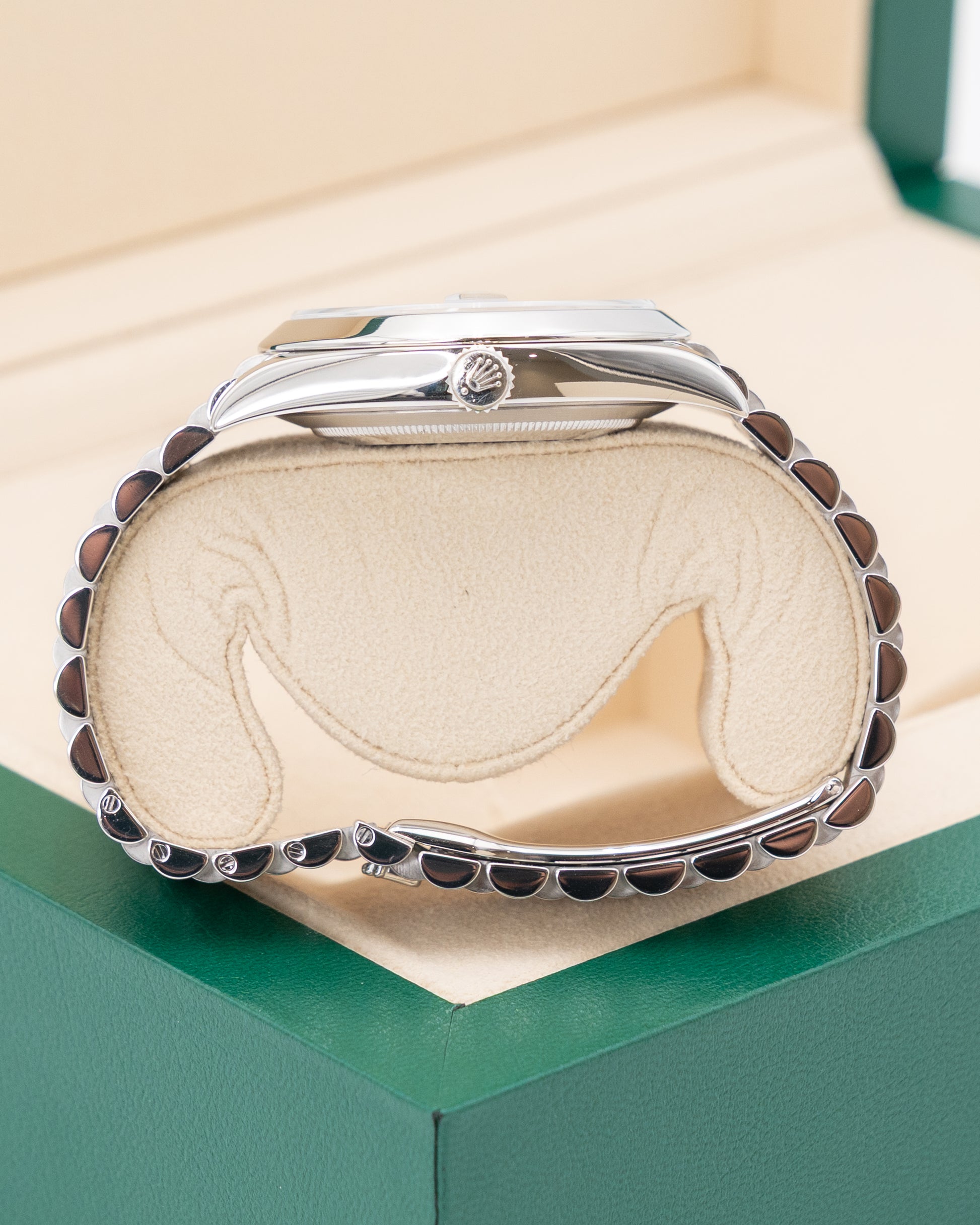 At its heart is the caliber 3255, a self-winding movement developed and manufactured entirely by Rolex. This cutting-edge movement provides remarkable accuracy, a 70-hour power reserve, and resistance to shocks and magnetic fields thanks to its Chronergy escapement. With a water resistance of 100 meters, the Day-Date 40 is not only a symbol of luxury and achievement but also a technically robust timepiece. This model embodies the pinnacle of Rolex’s artistry, combining platinum’s rare prestige with the unmistakable elegance of the Day-Date line.