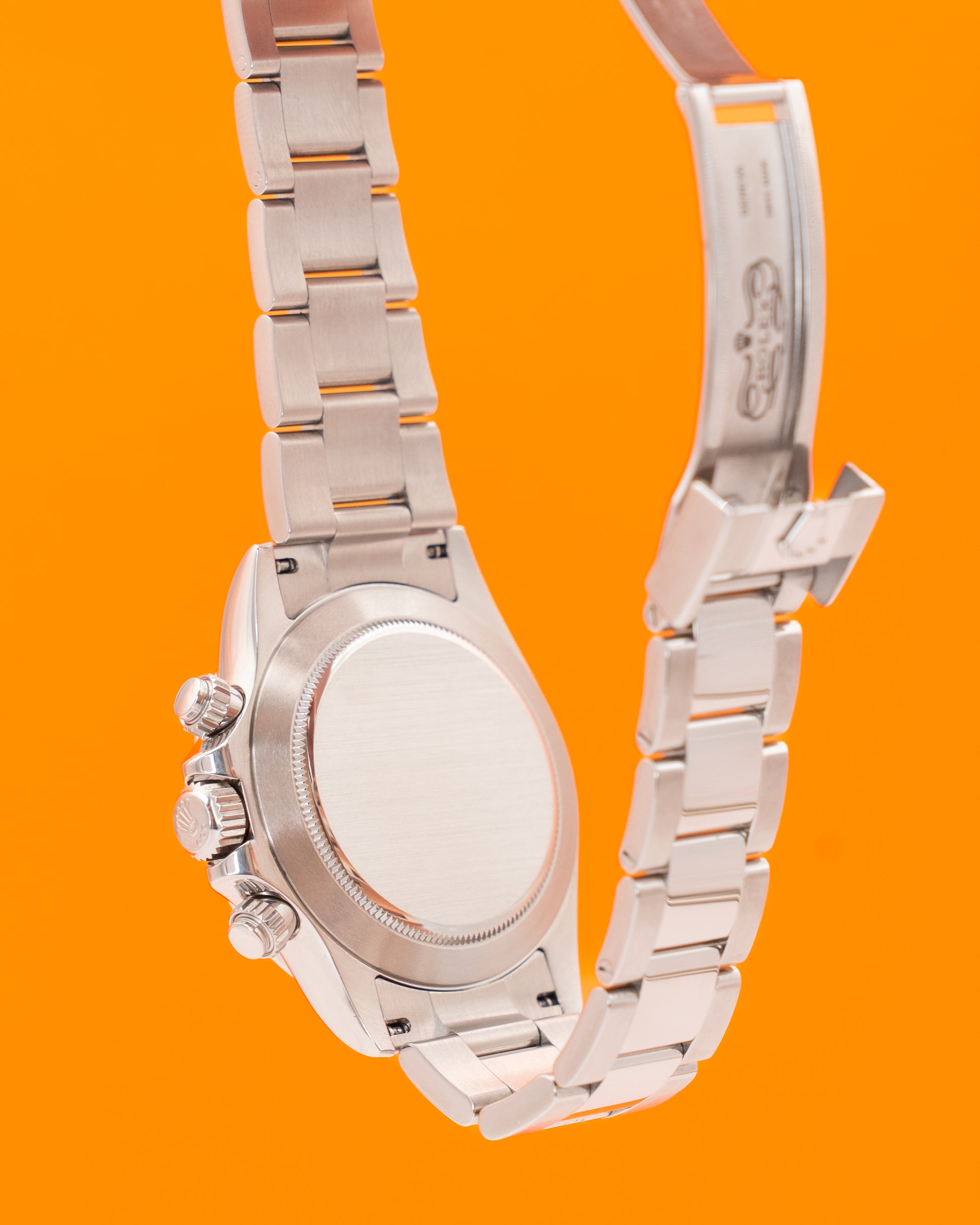 Powered by Rolex’s in-house Caliber 4130 — a column-wheel chronograph movement with a 72-hour power reserve — the 116520 delivers exceptional precision, smooth operation, and reliability. The Oyster bracelet, with its solid links and Oysterlock clasp, ensures a secure, comfortable fit for daily wear. With 100 meters of water resistance (not 10,000 m — likely a data error), it’s built for elegance and durability. The 116520 “Panda” Daytona remains a modern classic — perfect for collectors and enthusiasts who value Rolex’s heritage, bold design, and legendary chronograph performance.