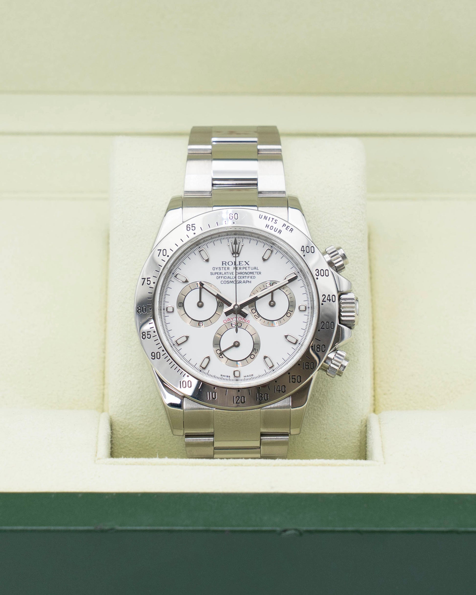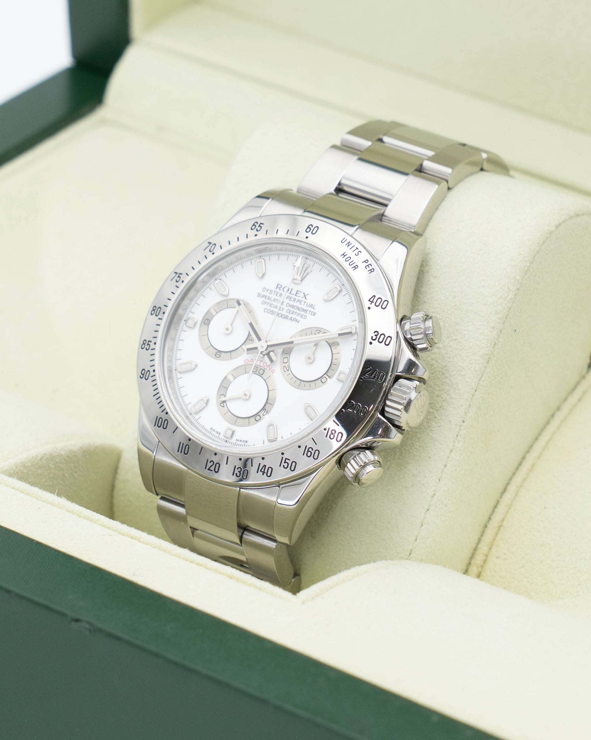 The Rolex Cosmograph Daytona, reference 116520-0016, is a legendary and highly sought-after chronograph that helped redefine the modern sports watch — released in 2011 as the first stainless steel Daytona with a white dial and Cerachrom bezel. Its 40 mm Oystersteel case houses a crisp white dial with applied hour markers and three black subdials — creating the iconic “Panda” layout that’s both legible and visually striking. The tachymeter scale on the black Cerachrom ceramic bezel allows for speed measurements, while the chronograph pushers add a sporty, dynamic character.