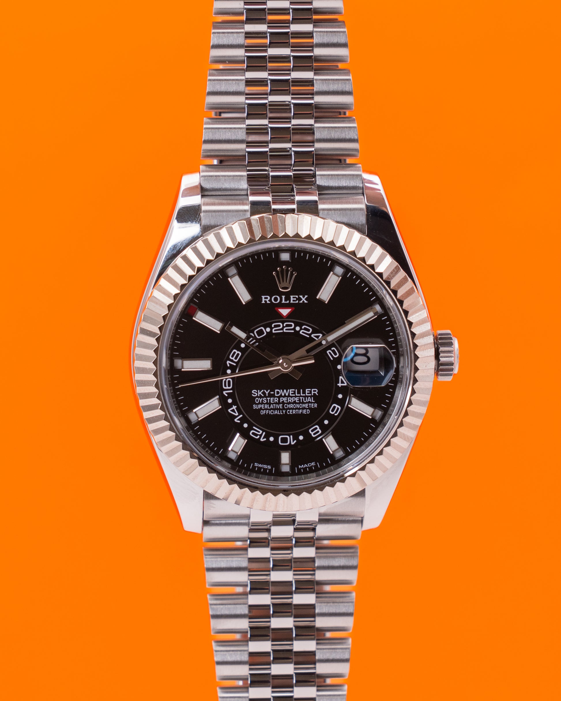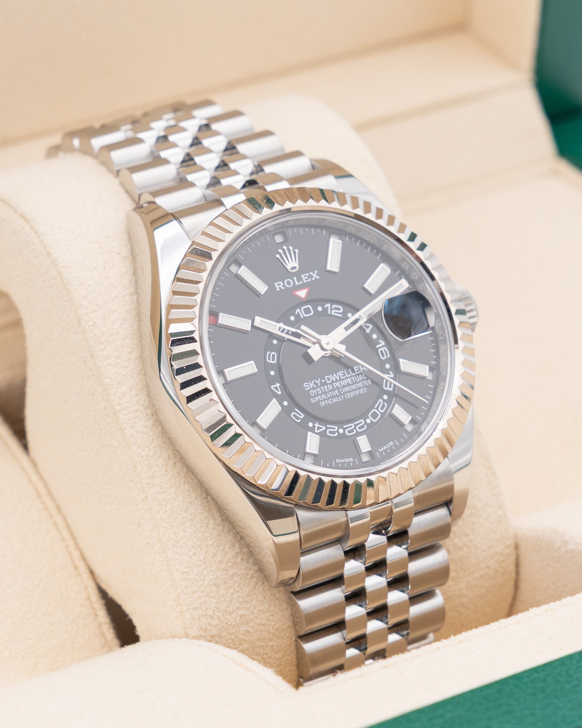 The Rolex Sky-Dweller Ref. 326934-0006 showcases Rolex’s mastery of technical innovation and elegant design within a bold 42mm case crafted from Oystersteel and 18K white gold. Its bright black dial stands out with a refined sunray finish, complemented by luminous hour markers and the distinctive off-center 24-hour disc that provides a dual-time function for travelers. The signature fluted white gold bezel is not just decorative but also functional—serving as the command interface for setting the watch’s multiple complications.