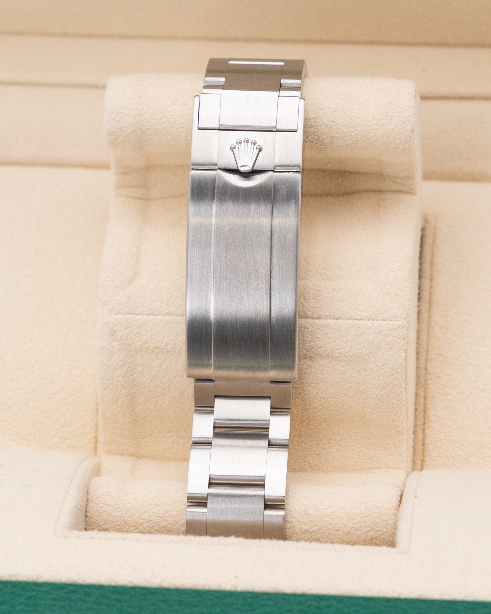 The Rolex Submariner Date 116610LV, affectionately known as the “Hulk,” is one of the brand’s most celebrated modern icons. Crafted entirely from corrosion-resistant stainless steel, this 40 mm dive watch commands attention with its striking green sunburst dial and matching Cerachrom ceramic bezel. The bold color palette, coupled with the Submariner’s timeless design, gives the “Hulk” a distinctive presence that stands apart in the Rolex lineup. Its Oyster case and solid-link bracelet deliver both strength and sophistication, making it as versatile as it is eye-catching.