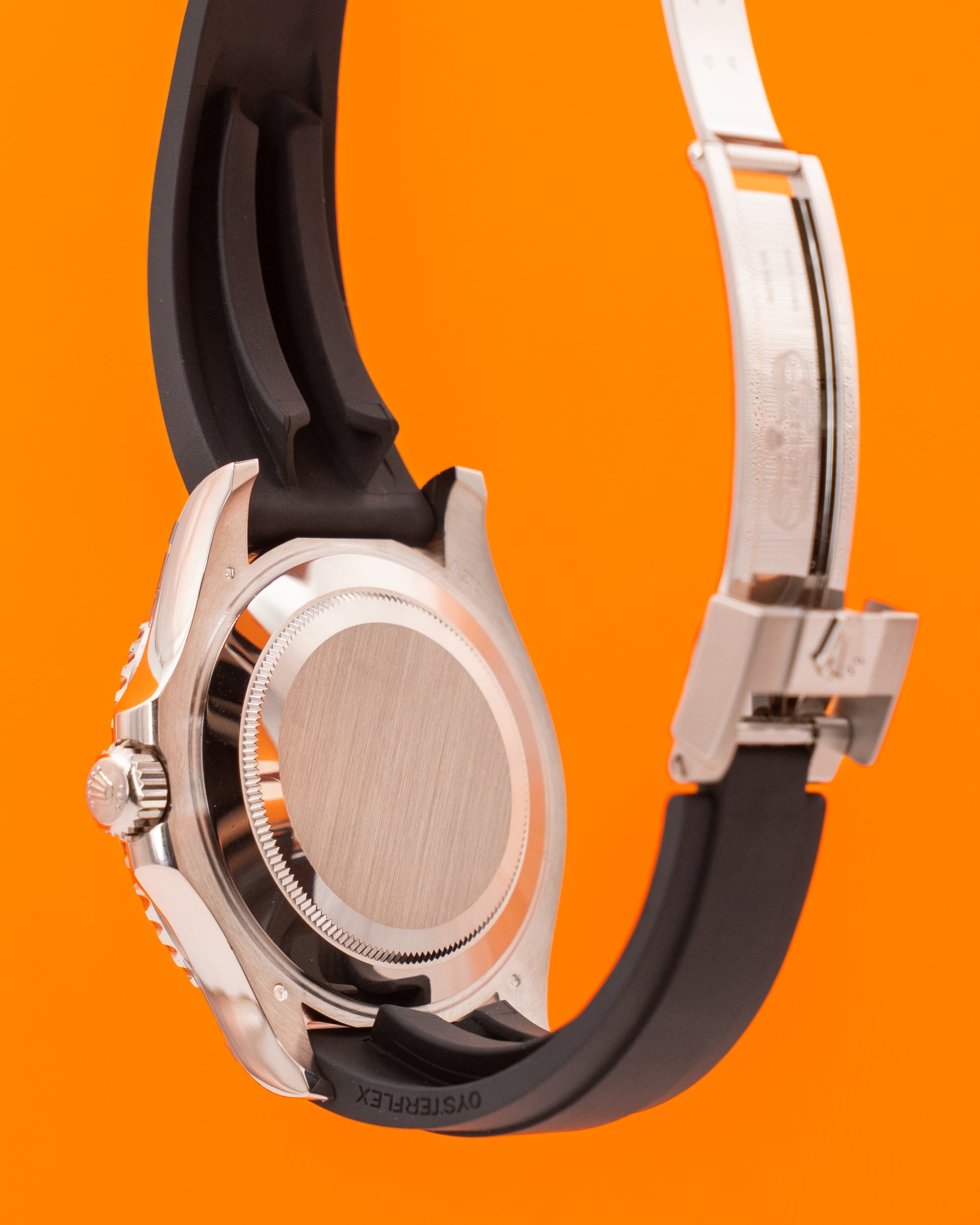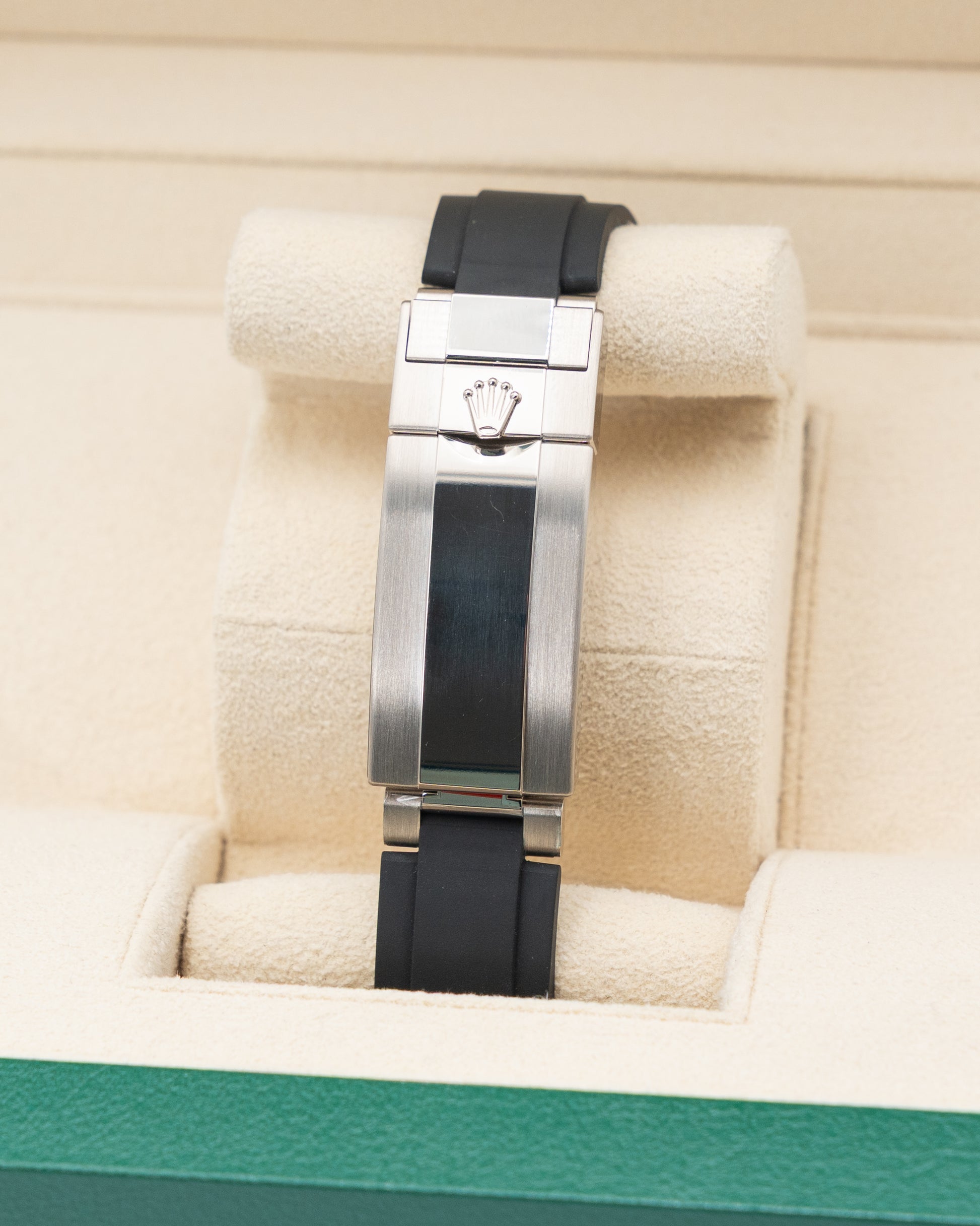 The Rolex Oysterflex (226659) is a bold and modern luxury timepiece that blends sporty innovation with classic Rolex craftsmanship. Its 42mm case is crafted from white gold, giving the watch a substantial yet elegant presence on the wrist. The black dial offers striking contrast with luminous hands and markers, enhancing readability while maintaining a sleek, contemporary look. Unlike traditional metal bracelets, this model features the Oysterflex strap, a high-performance elastomer with a metal core, combining the resilience of a bracelet with the comfort of a strap.