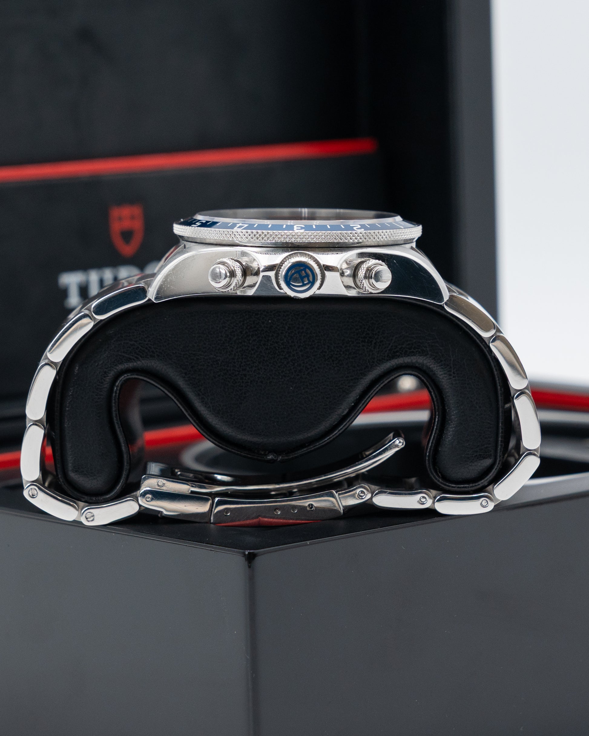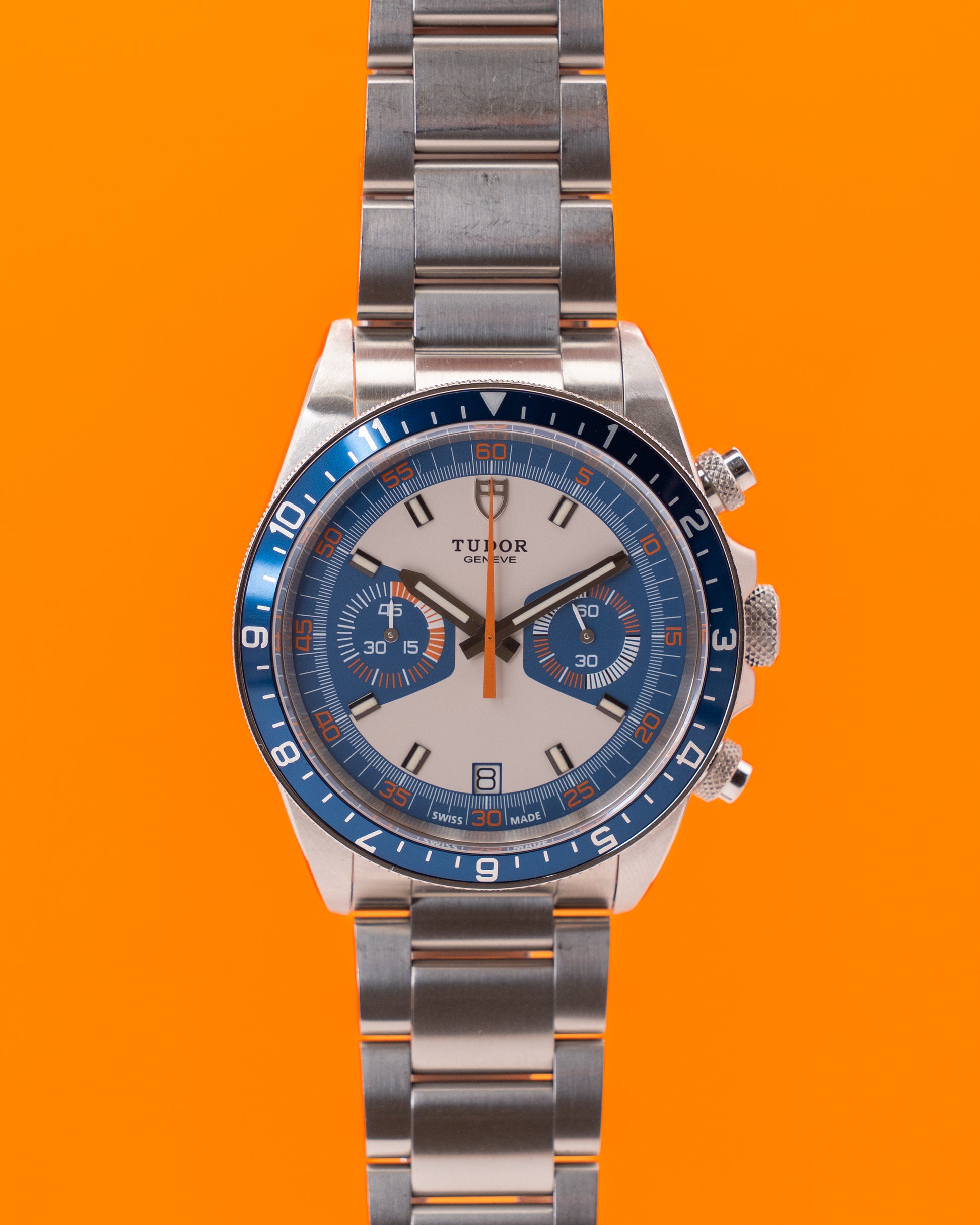 The Tudor Heritage Chrono Blue Ref. 70330B-0001 is a vibrant reinterpretation of a 1970s classic, merging retro charm with modern performance. Its 42mm stainless steel case presents a bold yet refined profile, perfectly framing the striking multi-color dial. Shades of blue, orange, and white evoke a distinctly nautical feel, inspired by Tudor’s vintage “Monte Carlo” chronographs. The dial features two subdials, a date display at 6 o’clock, and bold luminescent markers for optimal legibility, while the bidirectional blue bezel with 12-hour scale enhances both style and functionality.