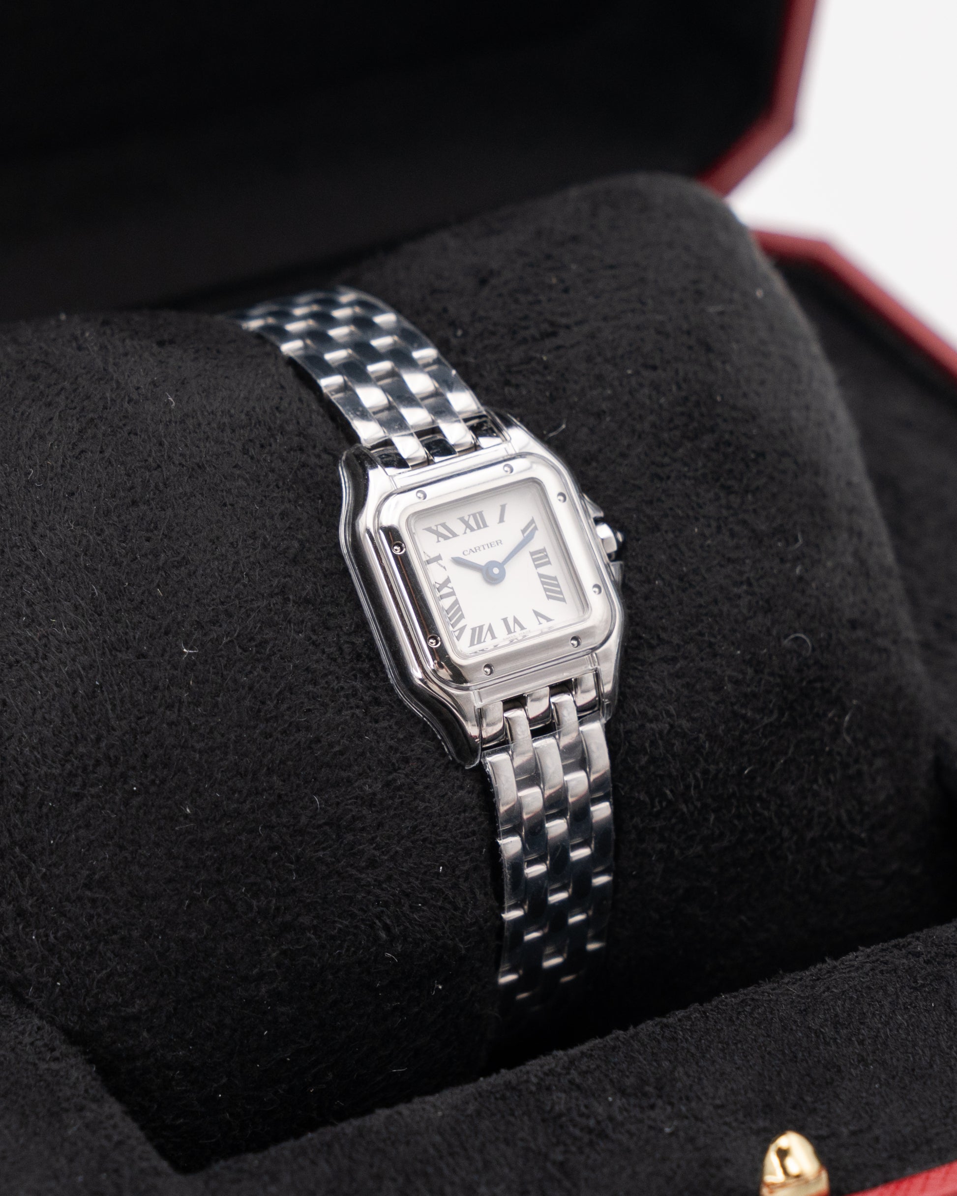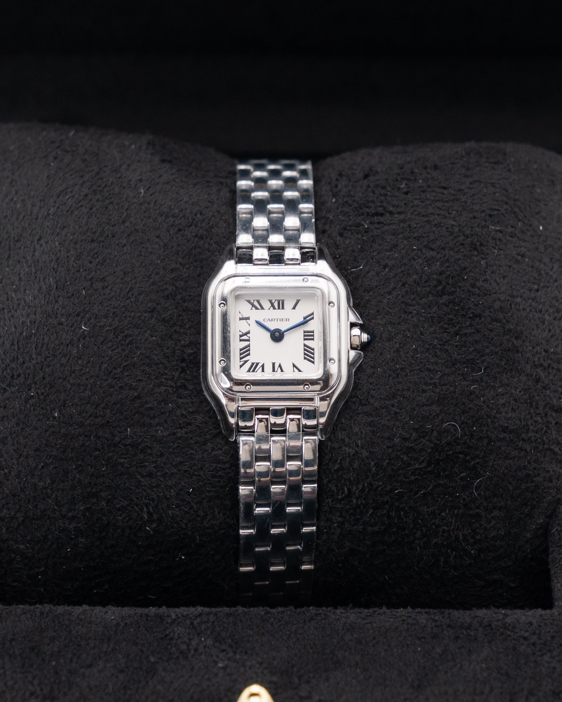Complementing its elegant case is a fully integrated stainless steel bracelet, renowned for its supple flexibility and jewelry-like comfort. Water-resistant to 30 meters, the Panthère de Cartier is powered by a precise quartz movement, ensuring effortless reliability. This watch is not merely a timepiece but a statement of style—radiating understated luxury that transitions seamlessly from day to evening, making it an essential piece for any refined collection.