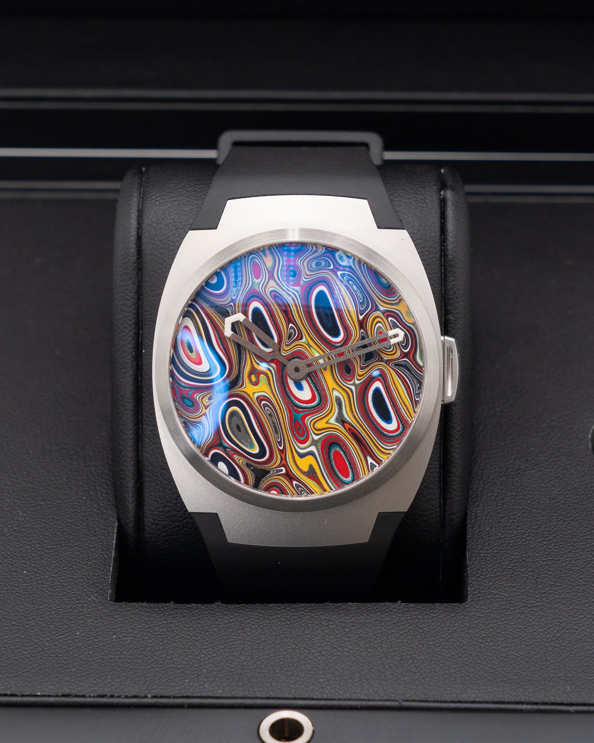 The UNWORN Arcanaut Denmark ARC II Fordite Dial 2024 is a bold contemporary timepiece that pushes the boundaries of watch design through the use of unconventional materials. Its dial, crafted from Fordite, showcases vibrant layers of cured automotive paint once used in vintage car factories. Each dial is entirely unique, presenting a mesmerizing array of colors and patterns that ensure no two watches are alike. Housed in Arcanaut’s sculptural case design, the watch embodies the brand’s avant-garde approach to Scandinavian minimalism fused with daring artistry.