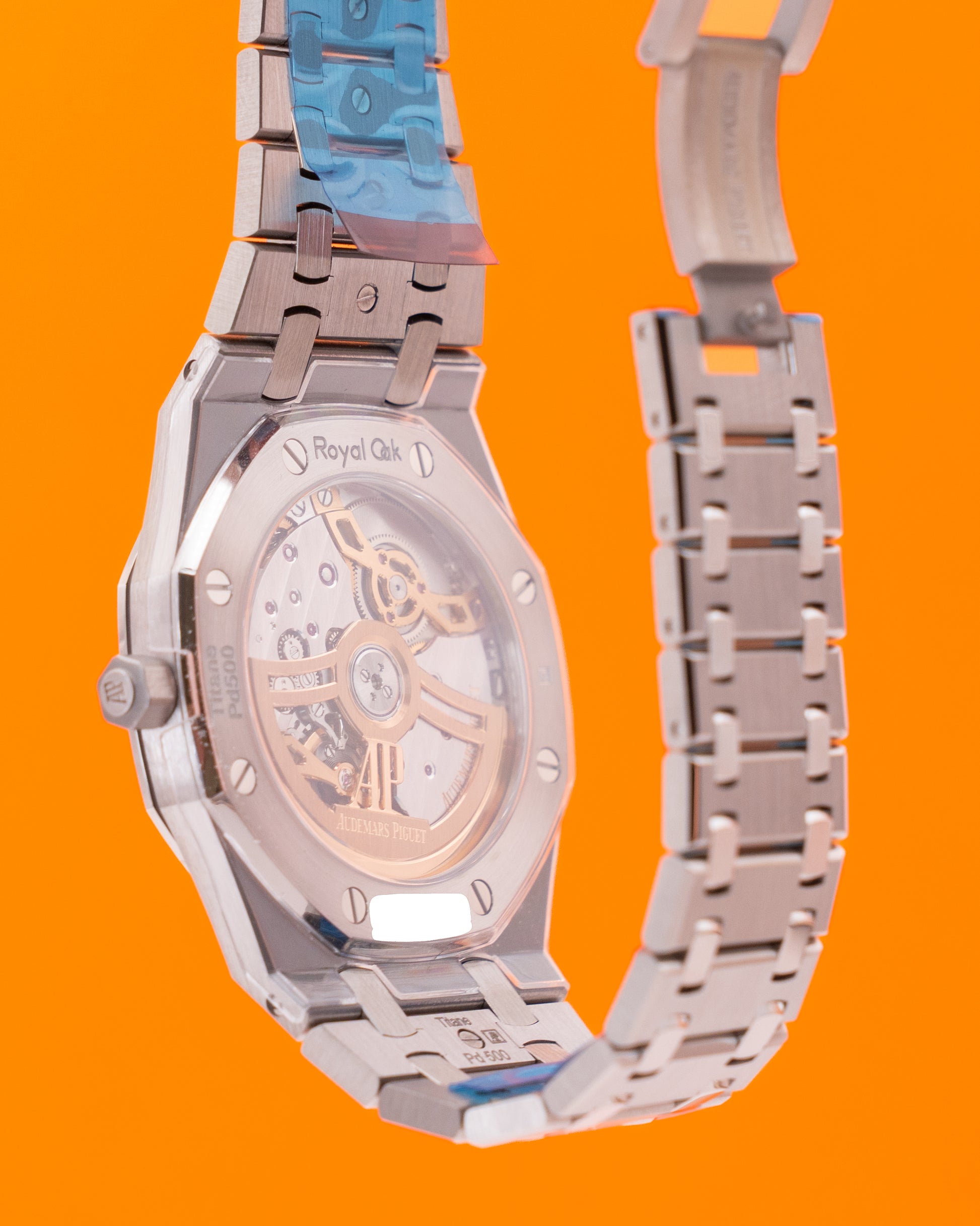 At the heart of this masterpiece lies the Caliber 7121, an ultra-thin self-winding movement developed to deliver both precision and power in a remarkably compact form. With a 55-hour power reserve and water resistance up to 50 meters, it combines sophistication with practical performance. Every surface—from the hand-finished bevels to the satin-brushed titanium links—reflects Audemars Piguet’s dedication to craftsmanship. The result is a timepiece that celebrates the Royal Oak legacy while embracing innovation, offering a perfect blend of heritage, artistry, and modern refinement.