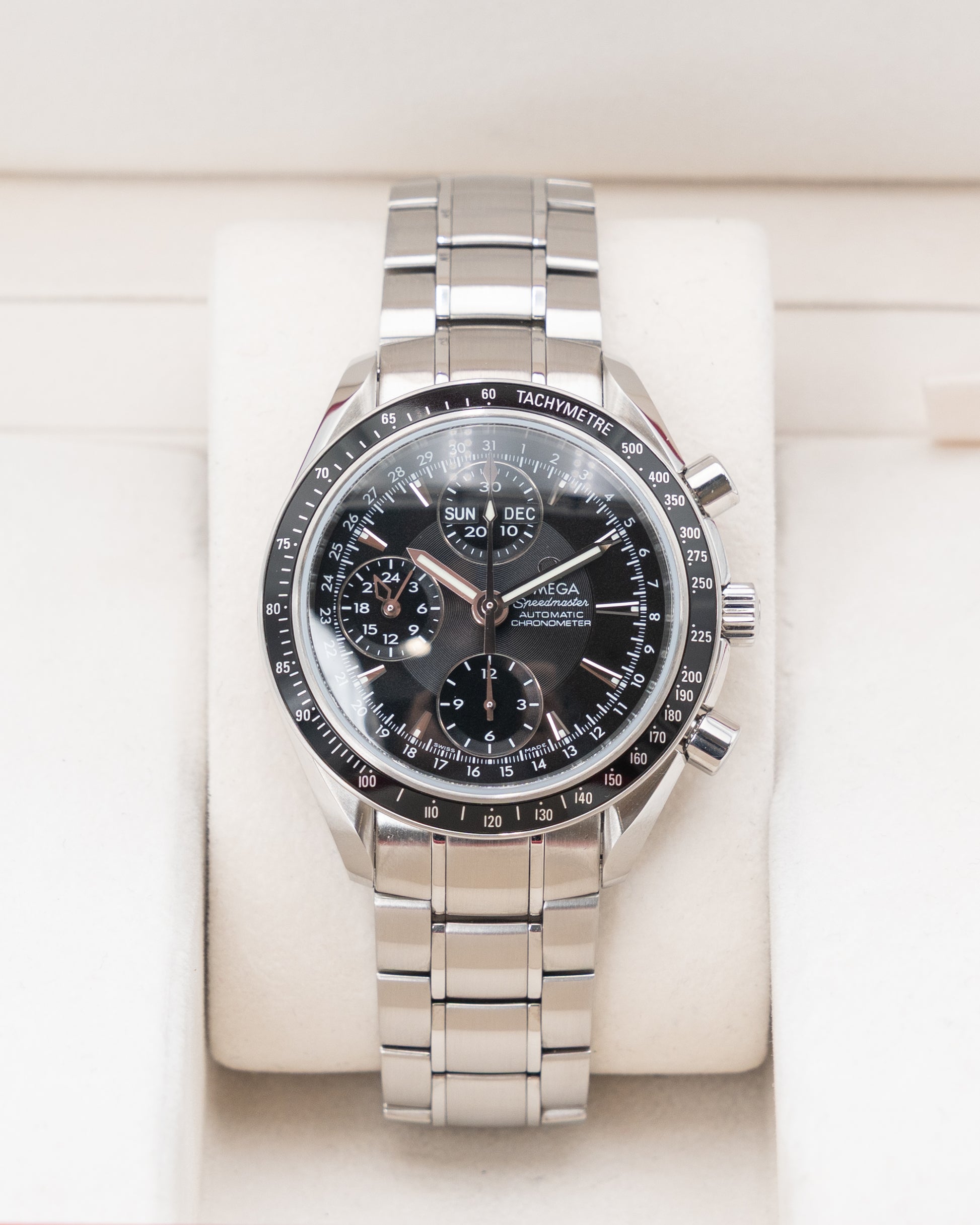 The Omega Speedmaster Day-Date Ref. 3220.50.00 is a refined evolution of Omega’s legendary chronograph line, blending technical complexity with everyday sophistication. Housed in a 40mm stainless steel case, it carries the instantly recognizable Speedmaster design DNA — from the black tachymeter bezel to the clean, symmetrical layout of its black dial. The dial itself offers a wealth of functionality, displaying not only the time but also day, date, and month indicators, balanced elegantly across its subdials. Luminous hands and markers ensure legibility, while the chronograph pushers retain the sporty yet classic character that defines the Speedmaster heritage.